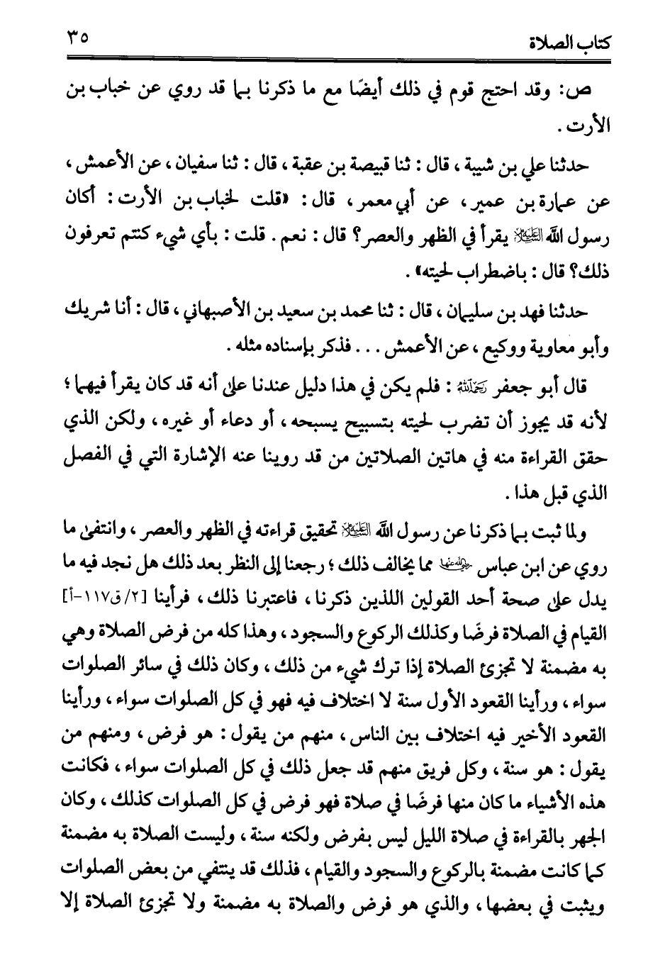 قال أبو جعفر -رحمه الله-: فلم يكن في هذا دليل عندنا على أنه قد كان يقرأ فيهما؛ لأنه قد يجوز أن تضرب لحيته بتسبيح يسبحه، أو دعاء أو غيره، ولكن الذي حقق القراءة منه في هاتين الصلاتين من قد روينا عنه الإشارة التي في الفصل الذي قبل هذا. ولما ثبت بما ذكرنا عن رسول الله - عليه السلام - تحقيق قراءته في الظهر والعصر، وانتفى ما روي عن ابن عباس - رضي الله عنه - مما يخالف ذلك؟ رجعنا إلى النظر بعد ذلك هل نجد فيه ما يدل على صحة أحد القولين اللذين ذكرنا، فاعتبرنا ذلك، فرأينا القيام في الصلاة فرضًا وكذلك الركوع والسجود، وهذا كله من فرض الصلاة وهي به مضمنة لا تجزئ الصلاة إذا ترك شيء من ذلك، وكان ذلك في سائر الصلوات سواء، ورأينا القعود الأول مسنة لا اختلاف فيه فهو في كل الصلوات سواء، ورأينا القعود الأخير فيه اختلاف بين الناس، منهم من يقول: هو فرض، ومنهم من يقول: هو سنة، وكل فريق منهم قد جعل ذلك في كل الصلوات سواء، فكانت هذه الأشياء ما كان منها فرضًا في صلاة فهو فرض في كل الصلوات كذلك، وكان الجهر بالقراءة في صلاة الليل ليس بفرض ولكنه سنة، وليست الصلاة به مضمنة كما كانت مضمنة بالركوع والسجود والقيام، قالك قد ينتفي من بعض الصلوات ويثبت في بعضها، والذي هو فرض والصلاة به مضمنة ولا تجزئ الصلاة إلا