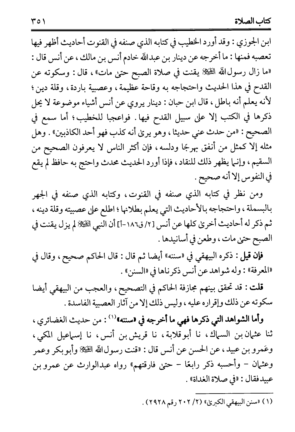 ابن الجوزي: وقد أورد الخطيب في كتابه الذي صنفه في القنوت أحاديث أظهر فيها تعصبه فمنها: ما أخرجه عن دينار بن عبد الله خادم أنس بن مالك، عن أنس قال: "ما زال رسول الله - عليه السلام - يقنت في صلاة الصبح حتى مات"، قال: وسكوته عن القدح في هذا الحديث واحتجاجه به وقاحة عظيمة، وعصبية باردة، وقلة دين؛ لأنه يعلم أنه باطل، قال ابن حبان: دينار يروي عن أنس أشياء موضوعة لا يحل ذكرها في الكتب إلا على سبيل القدح فيها. فواعجبا للخطيب؛ أما سمع في الصحيح: "من حدث عني حديثا، وهو يرى أنه كذب فهو أحد الكاذبين". وهل مثله إلا كمثل من أنفق بهرجًا ودلسه، فإن أكثر الناس لا يعرفون الصحيح من السقيم، وإنما يظهر ذلك للنقاد، فإذا أورد الحديث محدث واحتج به حافظ لم يقع في النفوس إلا أنه صحيح.