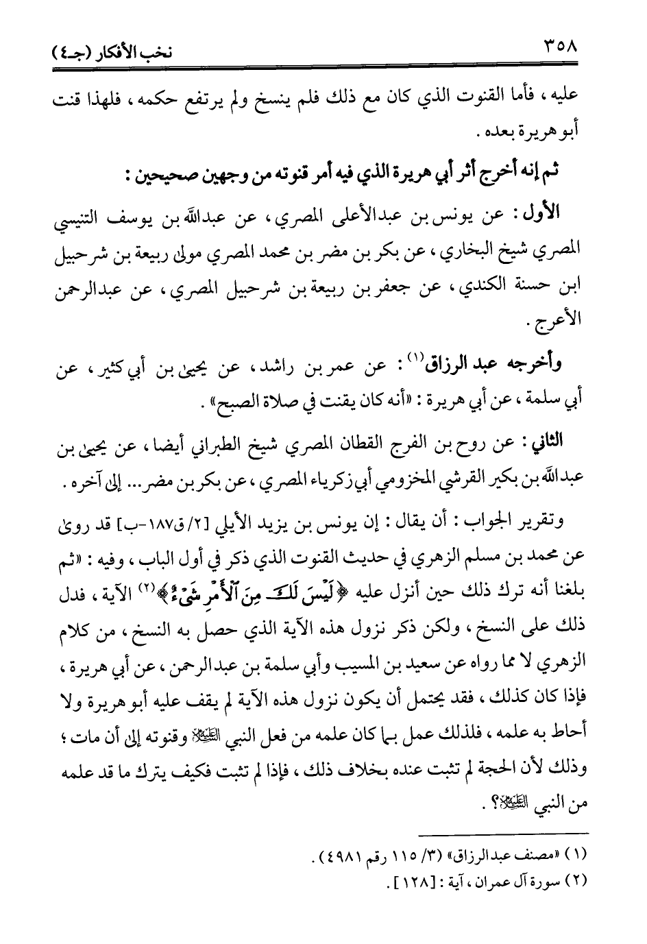 وتقرير الجواب: أن يقال: إن يونس بن يزيد الأيلي قد روى عن محمَّد بن مسلم الزهري في حديث القنوت الذي ذكر في أول الباب، وفيه: "ثم بلغنا أنه ترك ذلك حين أنزل عليه {لَيْسَ لَكَ مِنَ الْأَمْرِ شَيْءٌ} (¬2) الآية، فدل ذلك على النسخ، ولكن ذكر نزول هذه الآية الذي حصل به النسخ، من كلام الزهري لا مما رواه عن سعيد بن المسيب وأبي سلمة بن عبد الرحمن، عن أبي هريرة، فإذا كان كذلك، فقد يحتمل أن يكون نزول هذه الآية لم يقف عليه أبو هريرة ولا أحاط به علمه، فلذلك عمل بما كان علمه من فعل النبي - عليه السلام - وقنوته إلى أن مات؛ وذلك لأن الحجة لم تثبت عنده بخلاف ذلك، فإذا لم تثبت فكيف يترك ما قد علمه من النبي - عليه السلام -؟.