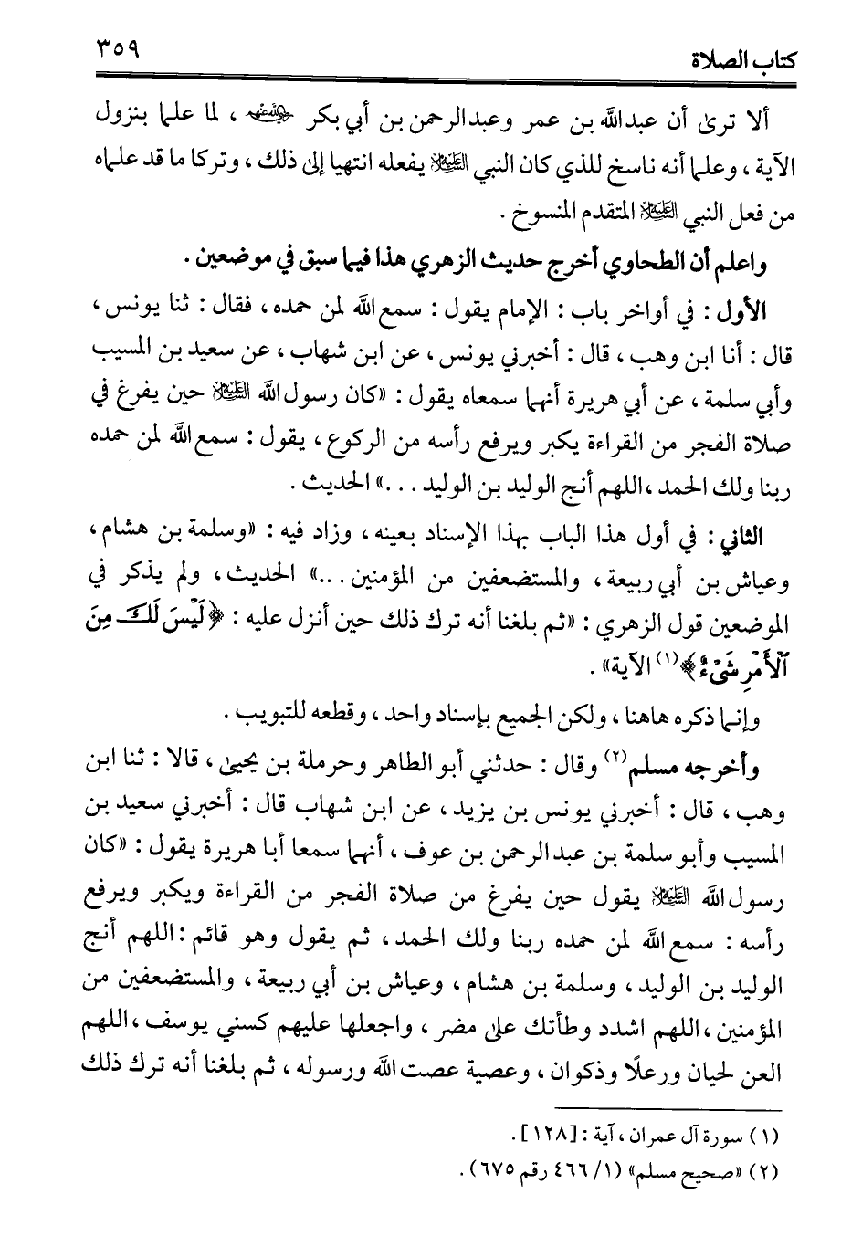 وأخرجه مسلم (¬2) وقال: حدثني أبو الطاهر وحرملة بن يحيى، قالا: ثنا ابن وهب، قال: أخبرني يونس بن يزيد، عن ابن شهاب قال: أخبرني سعيد بن المسيب وأبو سلمة بن عبد الرحمن بن عوف، أخهما سمعا أبا هريرة يقول: "كان رسول الله - عليه السلام - يقول حين يفرغ من صلاة الفجر من القراءة ويكبر ويرفع رأسه: سمع الله لمن حمده ربنا ولك الحمد، ثم يقول وهو قائم: اللهم أنج الوليد بن الوليد، وسلمة بن هشام، وعياش بن أبي ربيعة، والمستضعفين من المؤمنين، اللهم اشدد وطأتك على مضر، واجعلها عليهم كسني يوسف، اللهم العن لحيان ورعلًا وذكوان، وعصية عصت الله ورسوله، ثم بلغنا أنه ترك ذلك