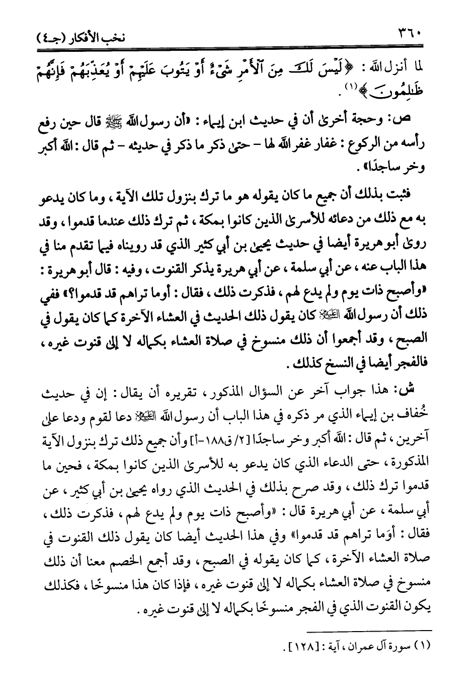 ش: هذا جواب آخر عن السؤال المذكور، تقريره أن يقال: إن في حديث خُفاف بن إيماء الذي مر ذكره في هذا الباب أن رسول الله - عليه السلام - دعا لقوم ودعا على آخرين، ثم قال: الله أكبر وخر ساجدًا وأن جميع ذلك ترك بنزول الآية المذكورة، حتى الدعاء الذي كان يدعو به للأسرى الذين كانوا بمكة، فحين ما قدموا ترك ذلك، وقد صرح بذلك في الحديث الذي رواه يحيى بن أبي كثير، عن أبي سلمة، عن أبي هريرة قال: "وأصبح ذات يوم ولم يدع لهم، فذكرت ذلك، فقال: أوَما تراهم قد قدموا" وفي هذا الحديث أيضًا كان يقول ذلك القنوت في صلاة العشاء الآخرة، كما كان يقوله في الصبح، وقد أجمع الخصم معنا أن ذلك منسوخ في صلاة العشاء بكماله لا إلى قنوت غيره، فإذا كان هذا منسوخًا، فكذلك يكون القنوت الذي في الفجر منسوخًا بكماله لا إلى قنوت غيره.