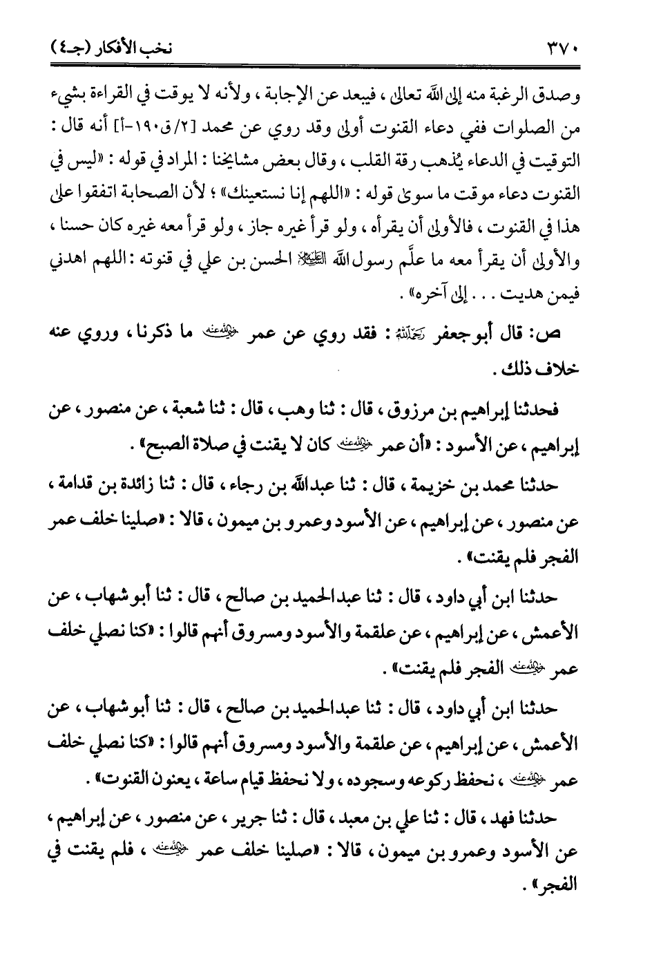 حدثنا محمَّد بن خزيمة، قال: ثنا عبد الله بن رجاء، قال: ثنا زائدة بن قدامة، عن منصور، عن إبراهيم، عن الأسود وعمرو بن ميمون، قالا: "صلينا خلف عمر الفجر فلم يقنت".