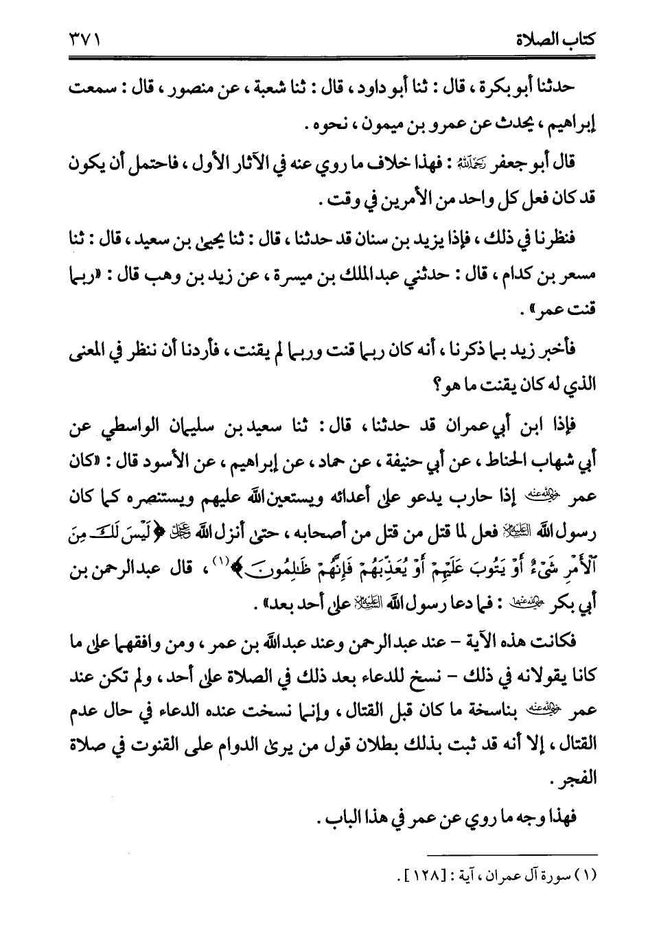 فنظرنا في ذلك، فإذا يزيد بن سنان قد حدثنا، قال: ثنا يحيى بن سعيد، قال: ثنا مسعر بن كدام، قال: حدثني عبد الملك بن ميسرة، عن زيد بن وهب قال: "ربما قنت عمر".