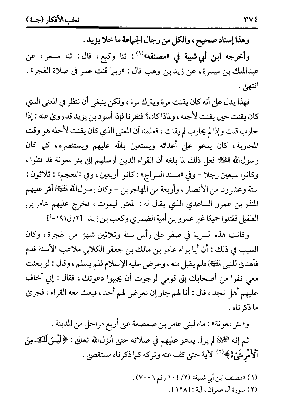 فهذا يدل على أنه كان يقنت مرة ويترك مرة، ولكن ينبغي أن ننظر في المعنى الذي كان يقنت حين يقنت لأجله، ولماذا كان؟ فنظرنا فإذا أسود بن يزيد قد روى عنه: إذا حارب قنت وإذا لم يحارب لم يقنت، فعلمنا أن المعنى الذي كان يقنت لأجله هو وقت المحاربة، كان يدعو على أعدائه ويستعين بالله عليهم ويستنصره، كما كان رسول الله - عليه السلام - فعل ذلك لما بلغه أن القراء الذين أرسلهم إلى بئر معونة قد قتلوا، وكانوا سبعين رجلًا -وفي "مسند السراج": كانوا أربعين، وفي "المعجم": ثلاثون: ستة وعشرون من الأنصار، وأربعة من المهاجرين- وكان رسول الله - عليه السلام - أمّر عليهم المنذر بن عمرو الساعدي الذي يقال له: المعتق ليموت، فخرج عليهم عامر بن الطفيل فقتلوا جميعًا غير عمرو بن أمية الضمري وكعب بن زيد.