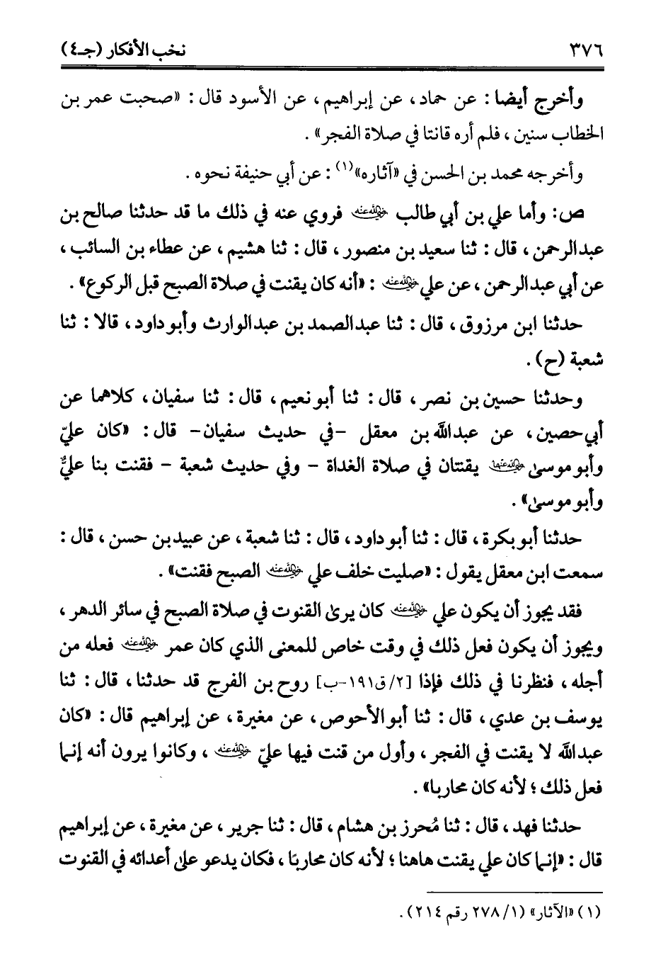 فقد يجوز أن يكون علي - رضي الله عنه - كان يرى القنوت في صلاة الصبح في سائر الدهر، ويجوز أن يكون فعل ذلك في وقت خاص للمعنى الذي كان عمر - رضي الله عنه - فعله من أجله، فنظرنا في ذلك فإذا روح بن الفرج قد حدثنا، قال: ثنا يوسف بن عدي، قال: ثنا أبو الأحوص، عن مغيرة، عن إبراهيم قال: "كان عبد الله لا يقنت في الفجر، وأول من قنت فيها عليّ - رضي الله عنه -، وكانوا يرون أنه إنما فعل ذلك؛ لأنه كان محاربا".