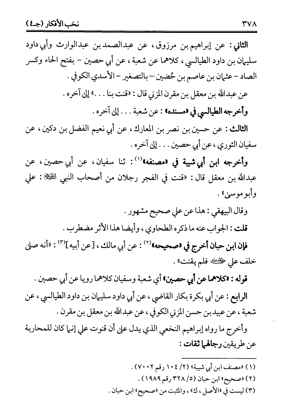 وأخرجه ابن أبي شيبة في "مصنفه" (¬1): ثنا سفيان، عن أبي حصين، عن عبد الله بن معقل قال: "قنت في الفجر رجلان من أصحاب النبي - عليه السلام -: علي وأبو موسي".