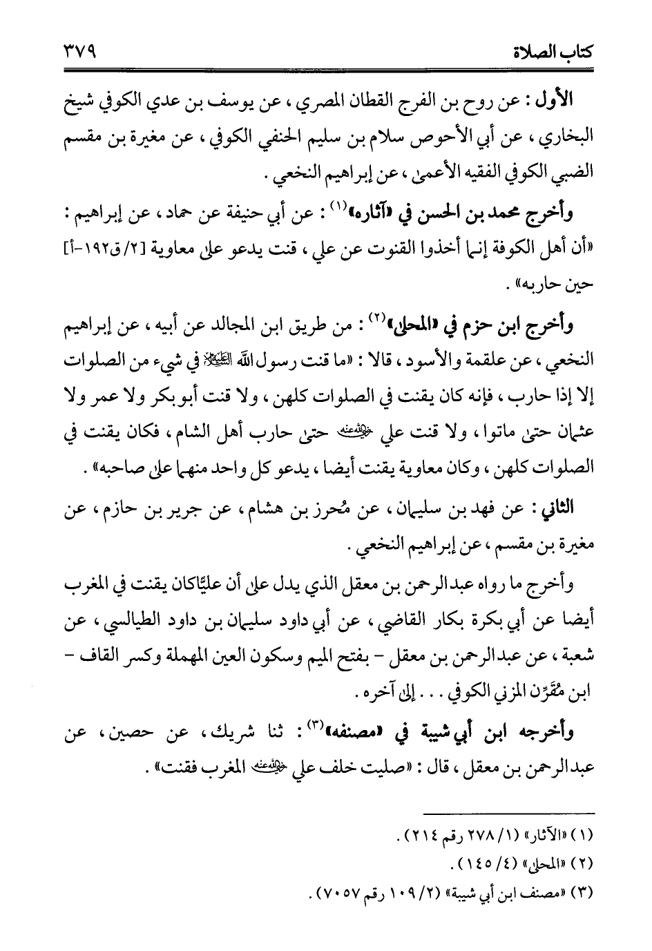 وأخرج ما رواه عبد الرحمن بن معقل الذي يدل على أن عليًّا كان يقنت في المغرب أيضًا عن أبي بكرة بكار القاضي، عن أبي داود سليمان بن داود الطيالسي، عن شعبة، عن عبد الرحمن بن معقل -بفتح الميم وسكون العين المهملة وكسر القاف- ابن مقرِّن المزني الكوفي ... إلى آخره.