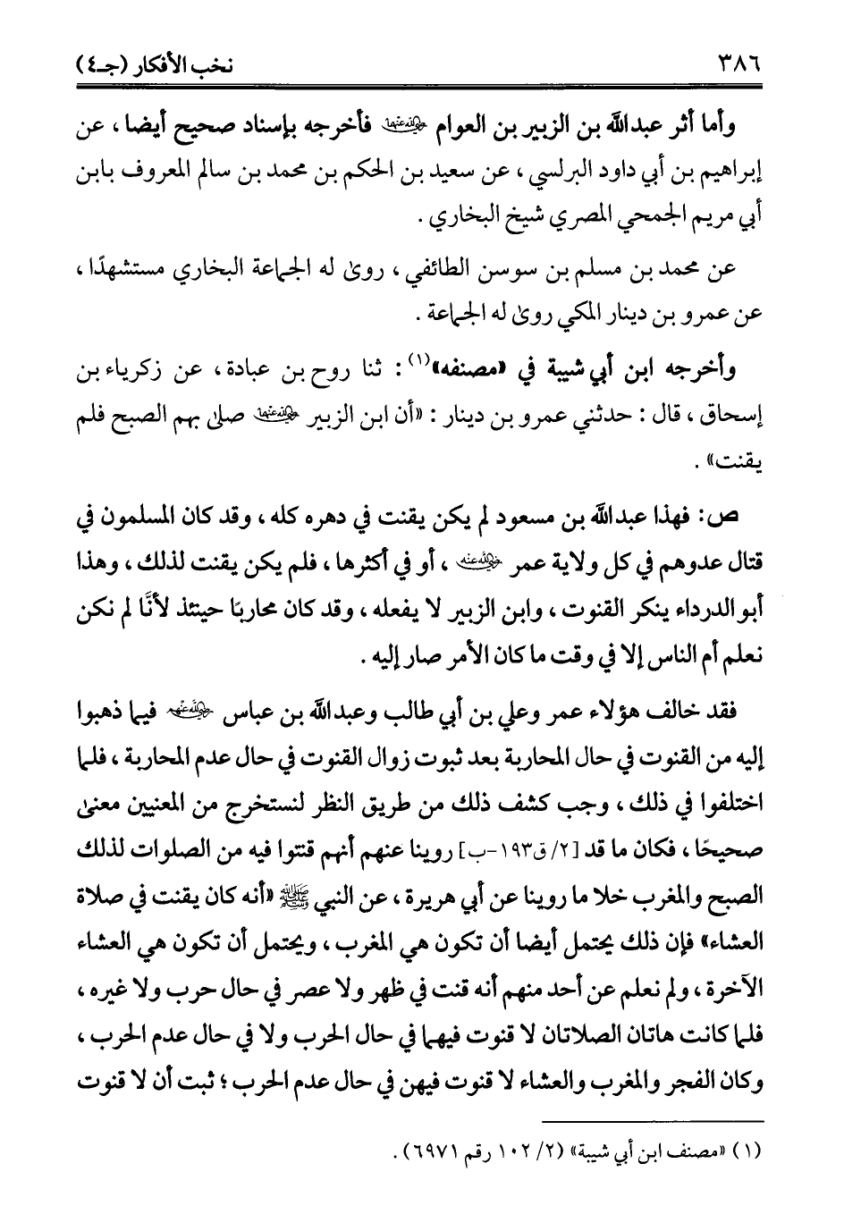 وأخرجه ابن أبي شيبة في "مصنفه" (¬1): ثنا روح بن عبادة، عن زكرياء بن إسحاق، قال: حدثني عمرو بن دينار: "أن ابن الزبير - رضي الله عنهما - صلى بهم الصبح فلم يقنت".