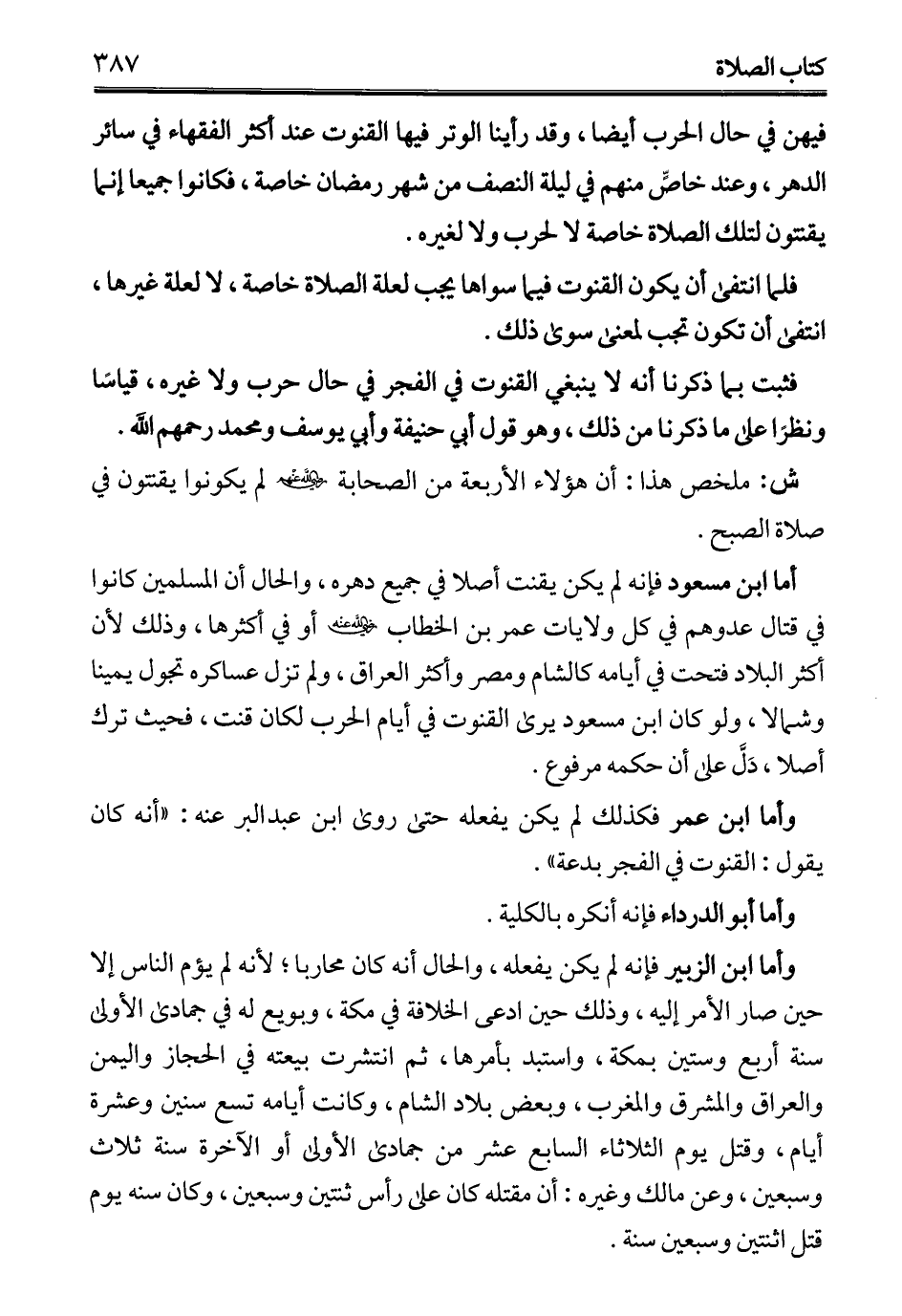 فثبت بما ذكرنا أنه لا ينبغي القنوت في الفجر في حال حرب ولا غيره، قياسًا ونظرًا على ما ذكرنا من ذلك، وهو قول أبي حنيفة وأبي يوسف ومحمد رحمهم الله.