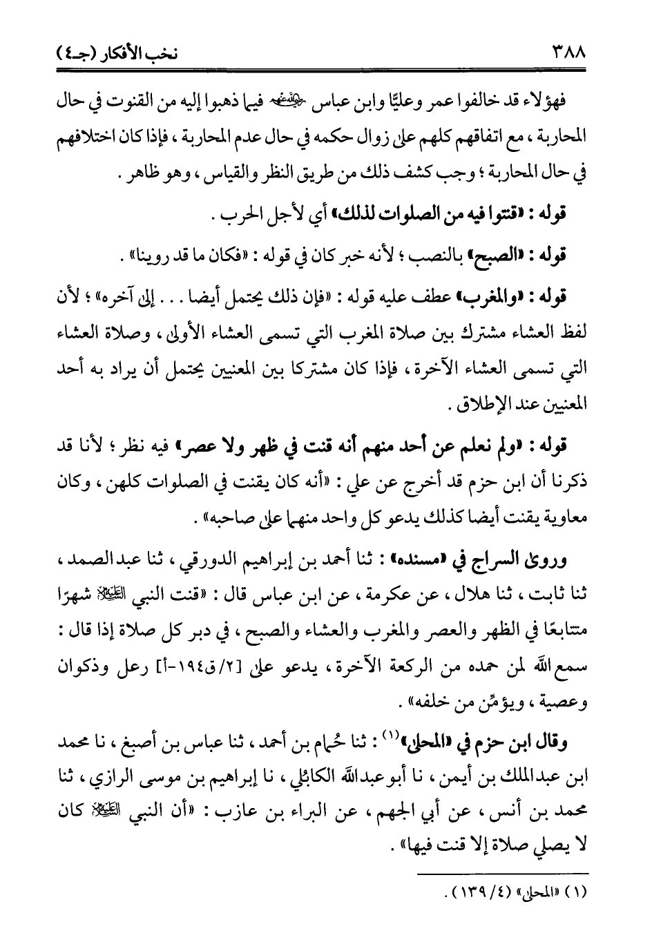 قوله: "ولم نعلم عن أحد منهم أنه قنت في ظهر ولا عصر" فيه نظر؛ لأنا قد ذكرنا أن ابن حزم قد أخرج عن علي: "أنه كان يقنت في الصلوات كلهن، وكان معاوية يقنت أيضًا كذلك يدعو كل واحد منهما على صاحبه".