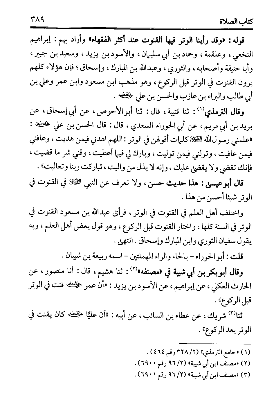 قوله: "وقد رأينا الوتر فيها القنوت عند أكثر الفقهاء" وأراد بهم: إبراهيم النخعي، وعلقمة، وحماد بن أبي سليمان، والأسود بن يزيد، وسعيد بن جبير، وأبا حنيفة وأصحابه، والثوري، وعبد الله بن المبارك، وإسحاق؛ فإن هؤلاء كلهم يرون القنوت في الوتر قبل الركوع، وهو مذهب ابن مسعود وابن عمر وعلي بن أبي طالب والبراء بن عازب والحسن بن علي - رضي الله عنهم -.