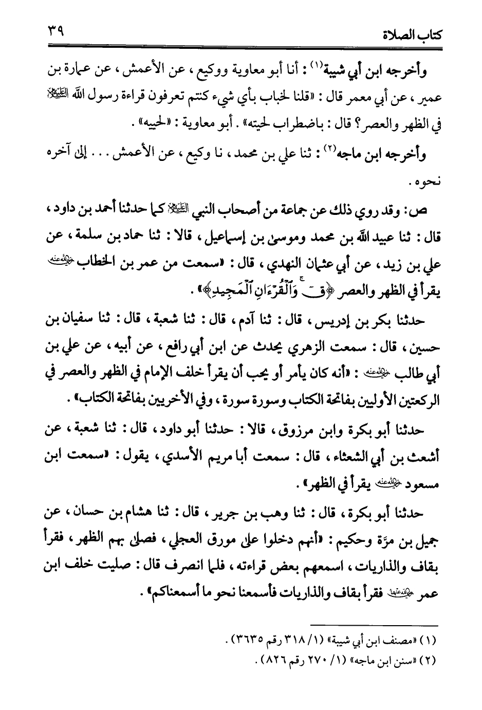 ص: وقد روي ذلك عن جماعة من أصحاب النبي - عليه السلام - كما حدثنا أحمد بن داود، قال: ثنا عبيد الله بن محمَّد وموسى بن إسماعيل، قالا: ثنا حماد بن سلمة، عن علي بن زيد، عن أبي عثمان النهدي، قال: "سمعت من عمر بن الخطاب - رضي الله عنه - يقرأ في الظهر والعصر {ق وَالْقُرْآنِ الْمَجِيدِ} ".