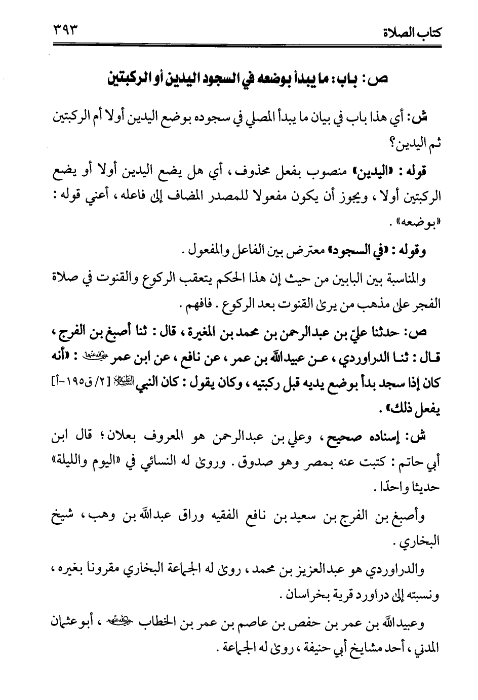 ص: حدثنا عليّ بن عبد الرحمن بن محمَّد بن المغيرة، قال: ثنا أصبغ بن الفرج، قال: ثنا الدراوردي، عن عبيدالله بن عمر، عن نافع، عن ابن عمر - رضي الله عنهما -: "أنه كان إذا سجد بدأ بوضع يديه قبل ركبتيه، وكان يقول: كان النبي - عليه السلام - يفعل ذلك".
