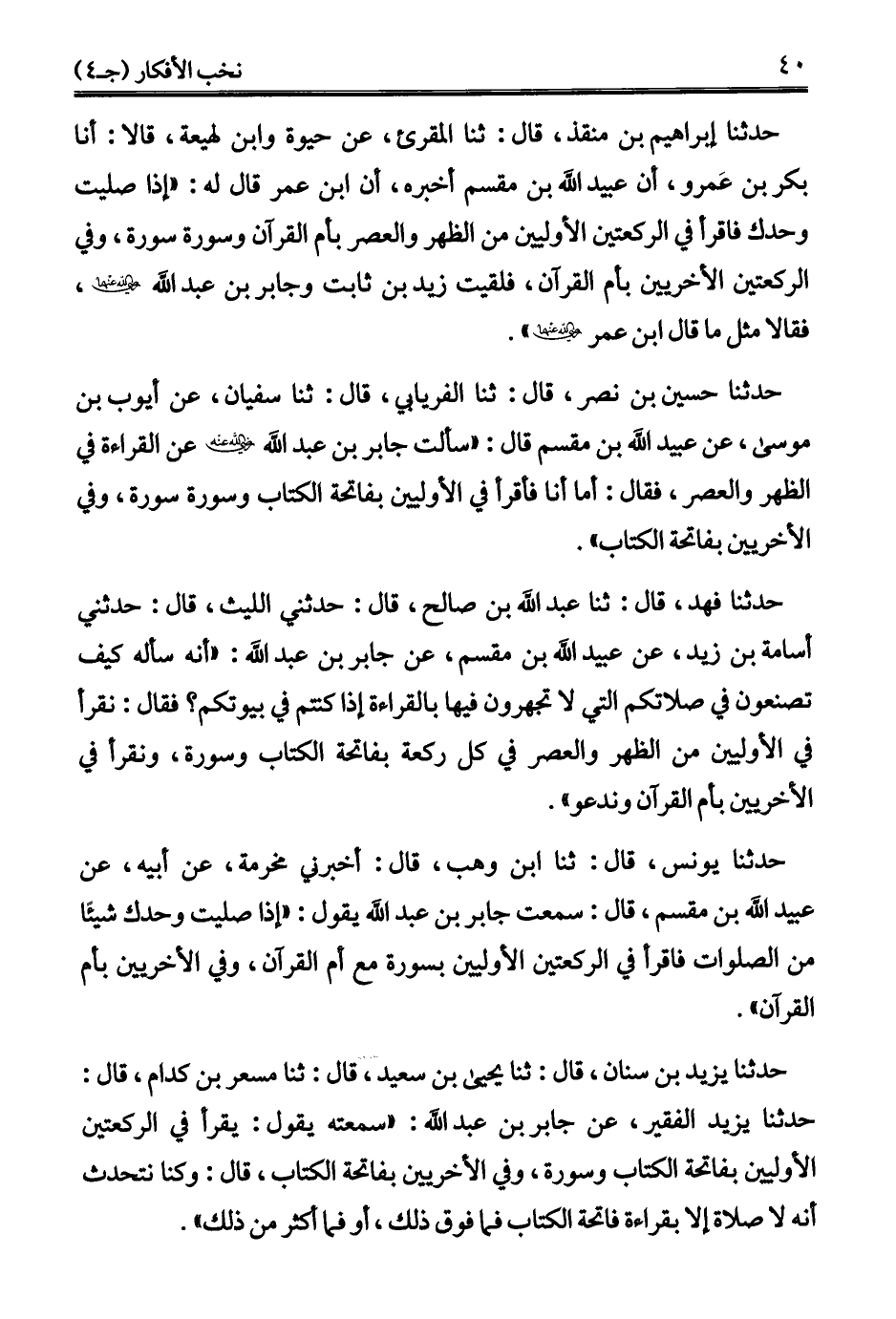 حدثنا حسين بن نصر، قال: ثنا الفريايى، قال: ثنا سفيان، عن أيوب بن موسى، عن عبيد الله بن مقسم قال: "سألت جابر بن عبد الله - رضي الله عنه - عن القراءة؛ في الظهر والعصر، فقال: أما أنا فاقرأ في الأوليين بفاتحة الكتاب وسورة سورة، وفي الأخريين بفاتحة الكتاب".