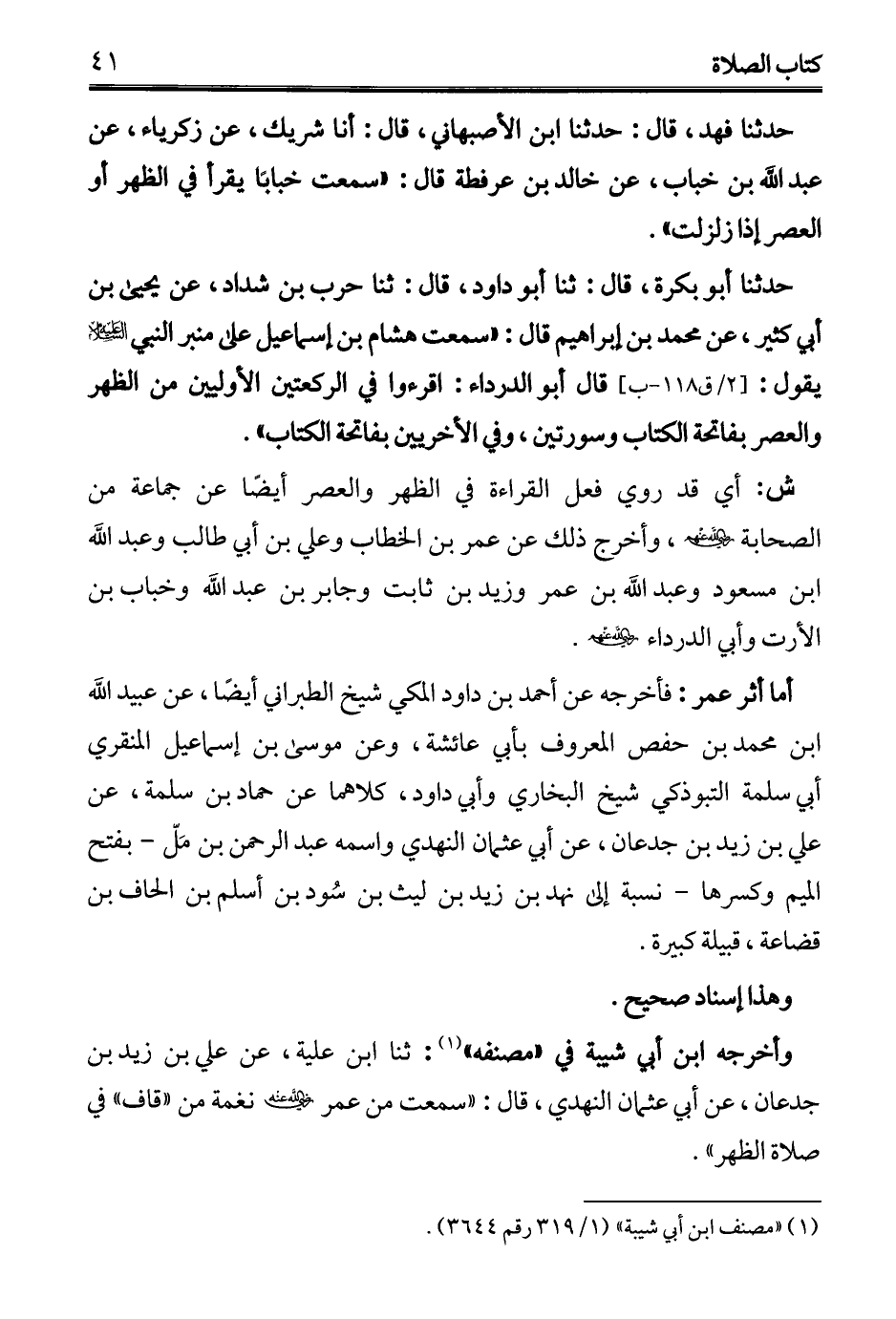 ش: أي قد روي فعل القراءة؛ في الظهر والعصر أيضًا عن جماعة من الصحابة - رضي الله عنهم -، وأخرج ذلك عن عمر بن الخطاب وعلي بن أبي طالب وعبد الله ابن مسعود وعبد الله بن عمر وزيد بن ثابت وجابر بن عبد الله وخباب بن الأرت وأبي الدرداء - رضي الله عنهم -.
