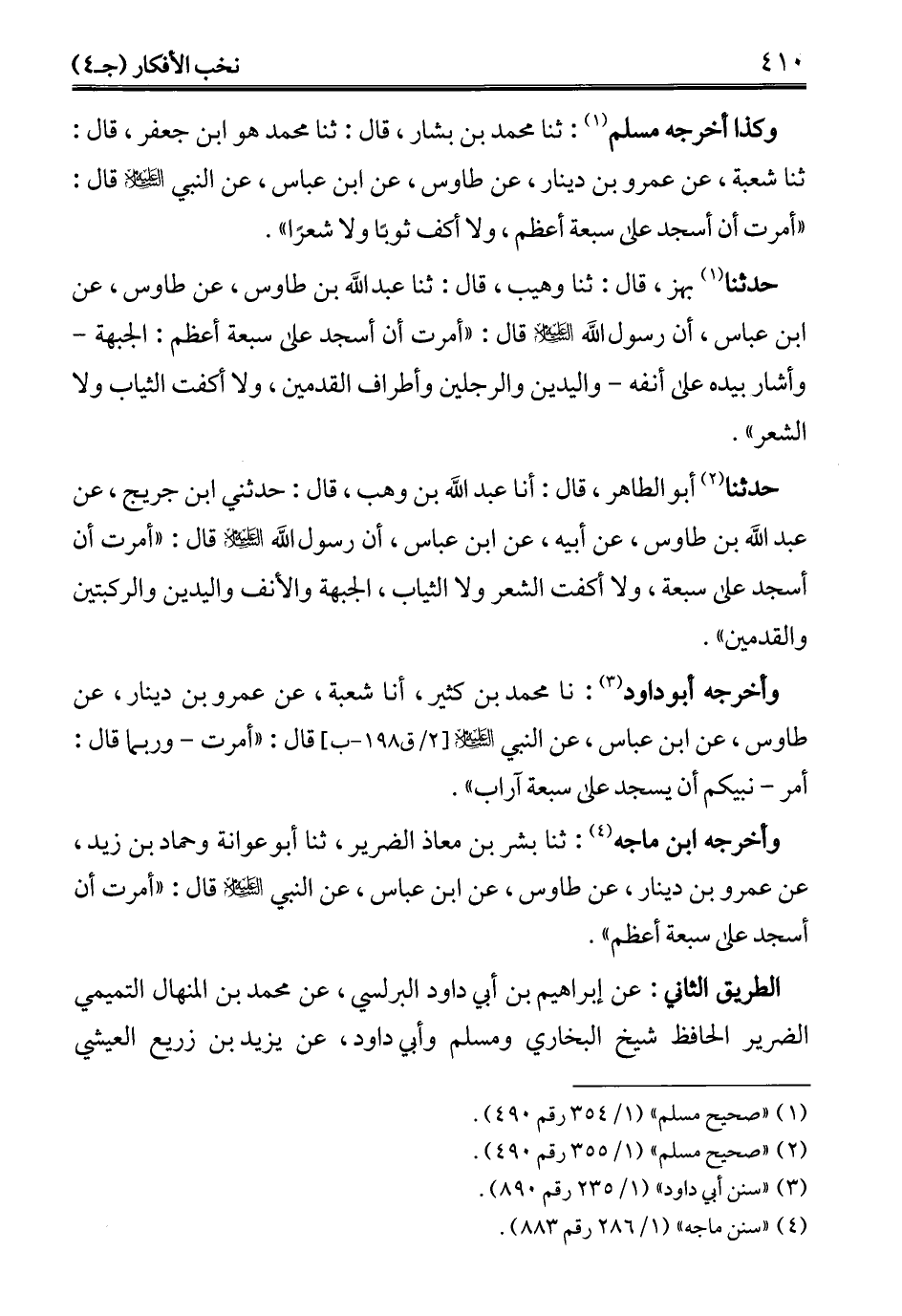 وأخرجه ابن ماجه (¬4): ثنا بشر بن معاذ الضرير، ثنا أبو عوانة وحماد بن زيد، عن عمرو بن دينار، عن طاوس، عن ابن عباس، عن النبي - عليه السلام - قال: "أمرت أن أسجد على سبعة أعظم".