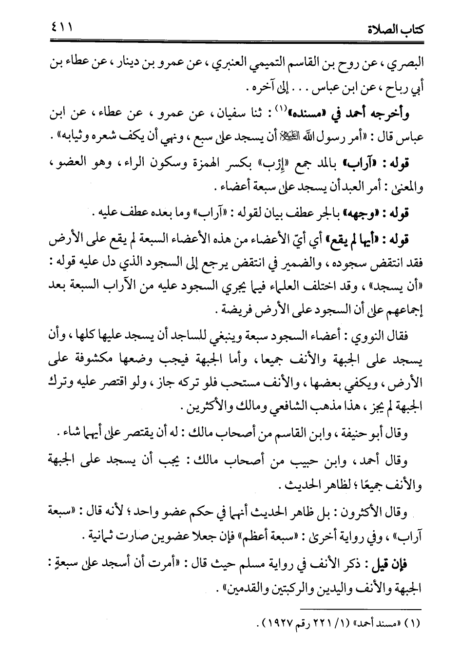 وأخرجه أحمد في "مسنده" (¬1): ثنا سفيان، عن عمرو، عن عطاء، عن ابن عباس قال: "أمر رسول الله - عليه السلام - أن يسجد على سبع، ونهي أن يكف شعره وثيابه".