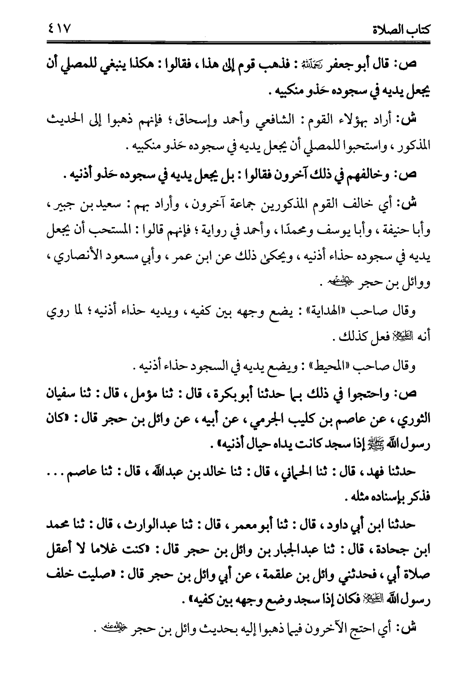 ش: أراد بهؤلاء القوم: الشافعي وأحمد وإسحاق؛ فإنهم ذهبوا إلى الحديث المذكور، واستحبوا للمصلي أن يجعل يديه في سجوده حَذو منكبيه.