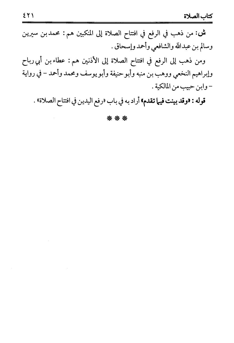 ش: من ذهب في الرفع في افتتاح الصلاة إلى المنكبين هم: محمد بن سيرين وسالم بن عبد الله والشافعي وأحمد وإسحاق.