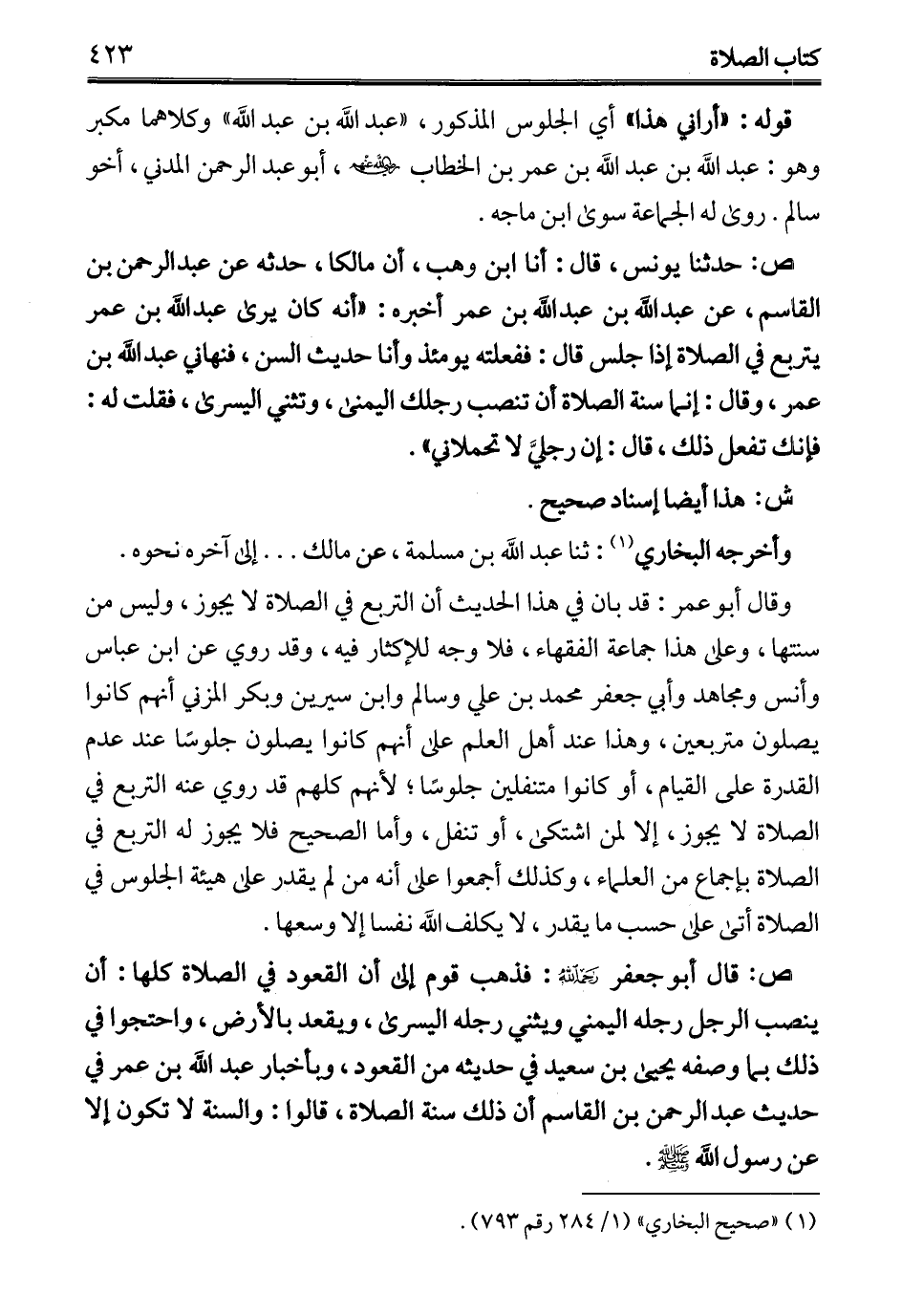ص: حدثنا يونس، قال: أنا ابن وهب، أن مالكا، حدثه عن عبد الرحمن بن القاسم، عن عبد الله بن عبد الله بن عمر أخبره: "أنه كان يرى عبد الله بن عمر يتربع في الصلاة إذا جلس قال: ففعلته يومئذ وأنا حديث السنن، فنهاني عبد الله بن عمر، وقال: إنما سنة الصلاة أن تنصب رجلك اليمنى، وتثني اليسرى، فقلت له: فإنك تفعل ذلك، قال: إن رجليَّ لا تحملاني".