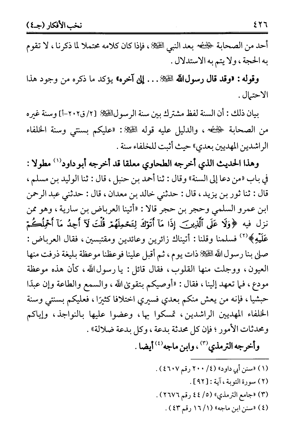 وهذا الحديث الذي أخرجه الطحاوي معلقا قد أخرجه أبو داود (¬1) مطولا: في باب "من دعا إلى السنة" وقال: ثنا أحمد بن حنبل، قال: ثنا الوليد بن مسلم، قال: ثنا ثور بن يزيد، قال: حدثني خالد بن معدان، قال: حدثني عبد الرحمن ابن عمرو السلمي وحجر بن حجر قالا: "أتينا العرباض بن سارية، وهو ممن نزل فيه {وَلَا عَلَى الَّذِينَ إِذَا مَا أَتَوْكَ لِتَحْمِلَهُمْ قُلْتَ لَا أَجِدُ مَا أَحْمِلُكُمْ عَلَيْهِ} (¬2) فسلمنا وقلنا: أتيناك زائرين وعائدين ومقتبسين، فقال العرباض: صلي بنا رسول الله - عليه السلام - ذات يوم، ثم أقبل علينا فوعظنا موعظة بليغة ذرفت منها العيون، ووجلت منها القلوب، فقال قائل: يا رسول الله - عليه السلام -، كأن هذه موعظة مودع، فما تعهد إلينا، فقال: "أوصيكم بتقوى الله، والسمع والطاعة وإن عبدًا حبشيا، فإنه من يعش منكم بعدي فسيري اختلافا كثيرًا، فعليكم بسنتي وسنة الخلفاء المهديين الراشدين، تمسكوا بها، وعضوا عليها بالنواجذ، وإياكم ومحدثات الأمور؛ فإن كل محدثة بدعة، وكل بدعة ضلالة".