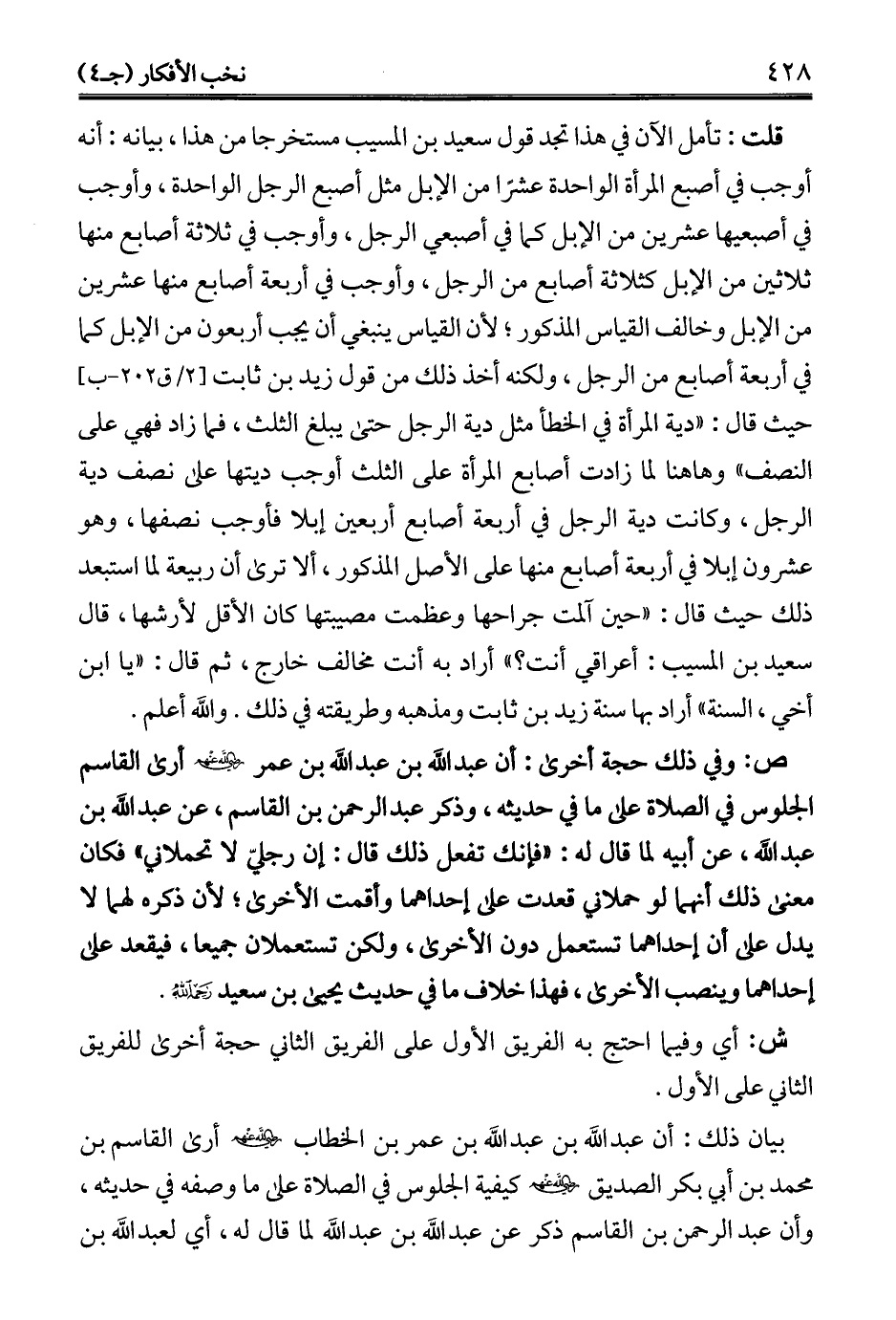 قلت: تأمل الآن في هذا تجد قول سعيد بن المسيب مستخرجا من هذا، بيانه: أنه أوجب في أصبع المرأة الواحدة عشرا من الإبل مثل أصبع الرجل الواحدة، وأوجب في أصبعيها عشرين من الإبل كما في أصبعي الرجل، وأوجب في ثلاثة أصابع منها ثلاثين من الإبل كثلاثة أصابع من الرجل، وأوجب في أربعة أصابع منها عشرين من الإبل وخالف القياس المذكور؛ لأن القياس ينبغي أن يجب أربعون من الإبل كما في أربعة أصابع من الرجل، ولكنه أخذ ذلك من قول زيد بن ثابت حيث قال: "دية المرأة في الخطأ مثل دية الرجل حتى يبلغ الثلث، فما زاد فهي على النصف" وها هنا لما زادت أصابع المرأة على الثلث أوجب ديتها على نصف دية الرجل، وكانت دية الرجل في أربعة أصابع أربعين إبلا فأوجب نصفها، وهو عشرون إبلا في أربعة أصابع منها على الأصل المذكور، ألا ترى أن ربيعة لما استبعد ذلك حيث قال: "حين آلمت جراحها وعظمت مصيبتها كان الأقل لأرشها، قال سعيد بن المسيب: أعراقي أنت؟ " أراد به أنت مخالف خارج، ثم قال: "يا ابن أخي، السنة" أراد بها سنة زيد بن ثابت ومذهبه وطريقته في ذلك. والله أعلم.