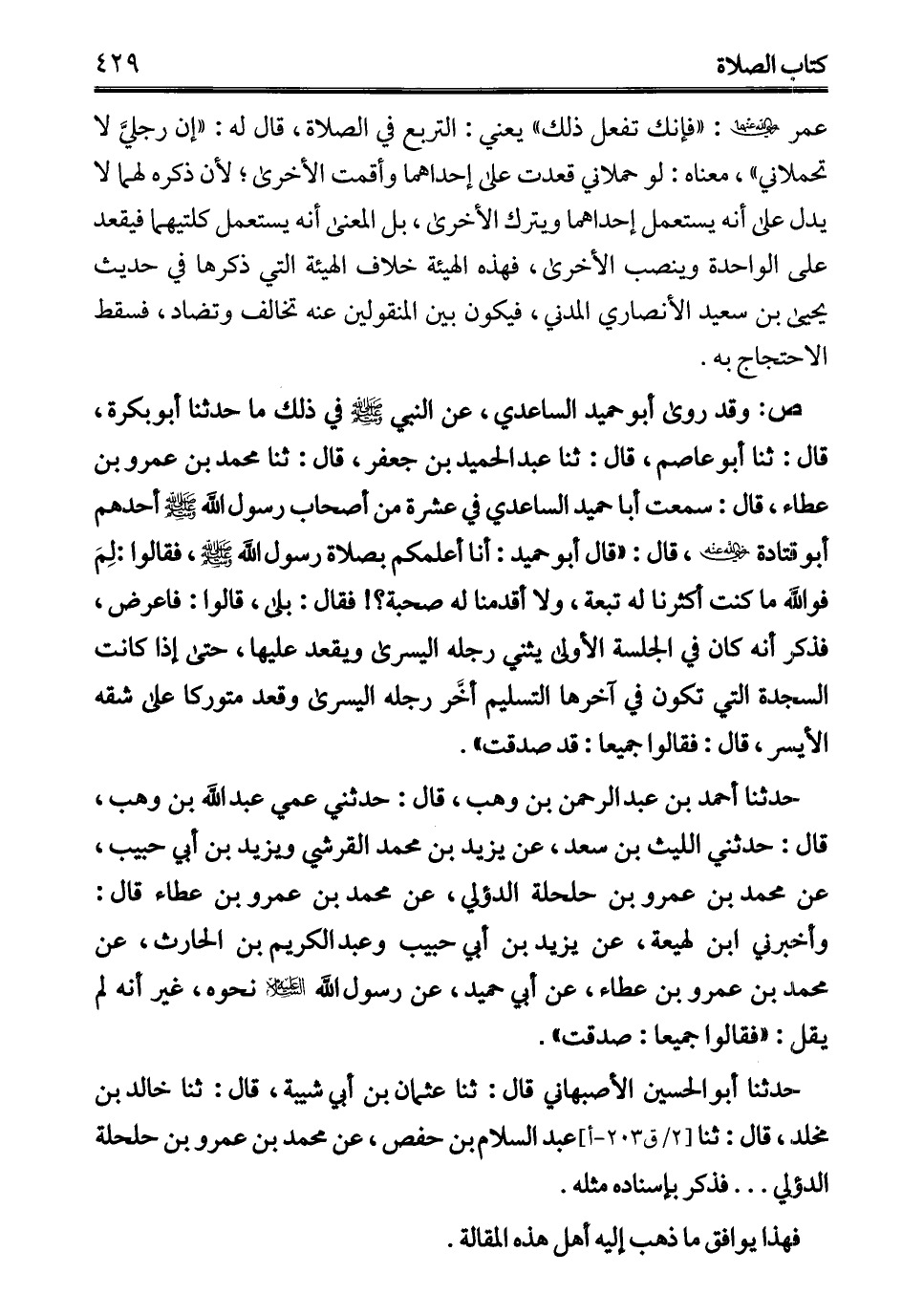 عمر - رضي الله عنها -: "فإنك تفعل ذلك" يعني: التربع في الصلاة، قال له: "إن رجليَّ لا تحملاني"، معناه: لو حملاني قعدت على إحداهما وأقمت الأخرى؛ لأن ذكره لهما لا يدل على أنه يستعمل إحداهما ويترك الأخرى، بل المعنى أنه يستعمل كلتيهما فيقعد على الواحدة وينصب الأخرى، فهذه الهيئة خلاف الهيئة التي ذكرها في حديث يحيى بن سعيد الأنصاري المدني، فيكون بين المنقولين عنه تخالف وتضاد، فسقط الاحتجاج به.