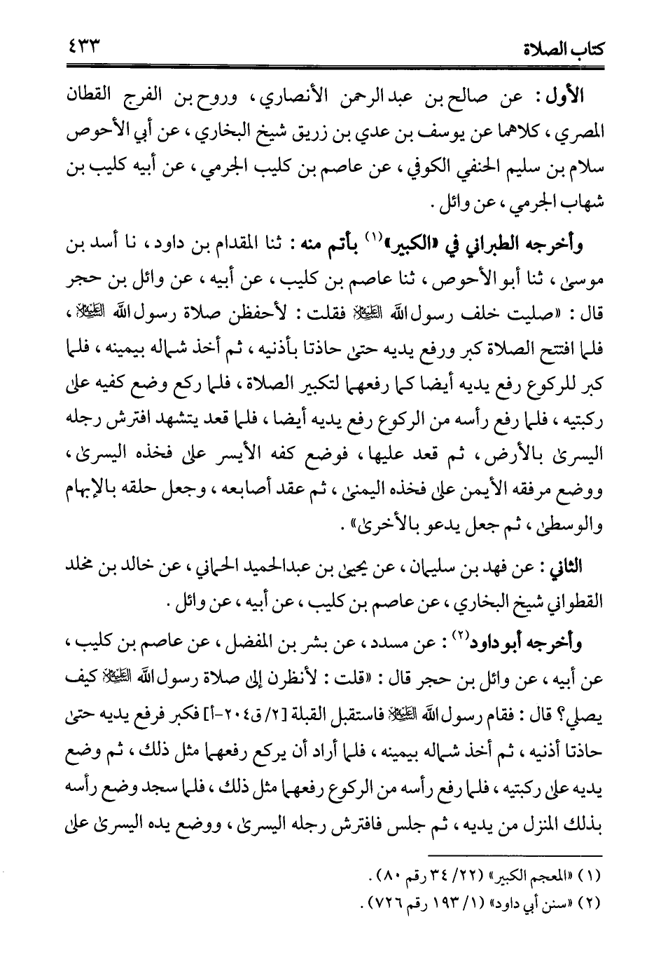 الأول: عن صالح بن عبد الرحمن الأنصاري، وروح بن الفرج القطان المصري، كلاهما عن يوسف بن عدي بن زريق شيخ البخاري، عن أبي الأحوص سلام بن سليم الحنفي الكوفي، عن عاصم بن كليب الجرمي، عن أبيه كليب بن شهاب الجرمي، عن وائل.
