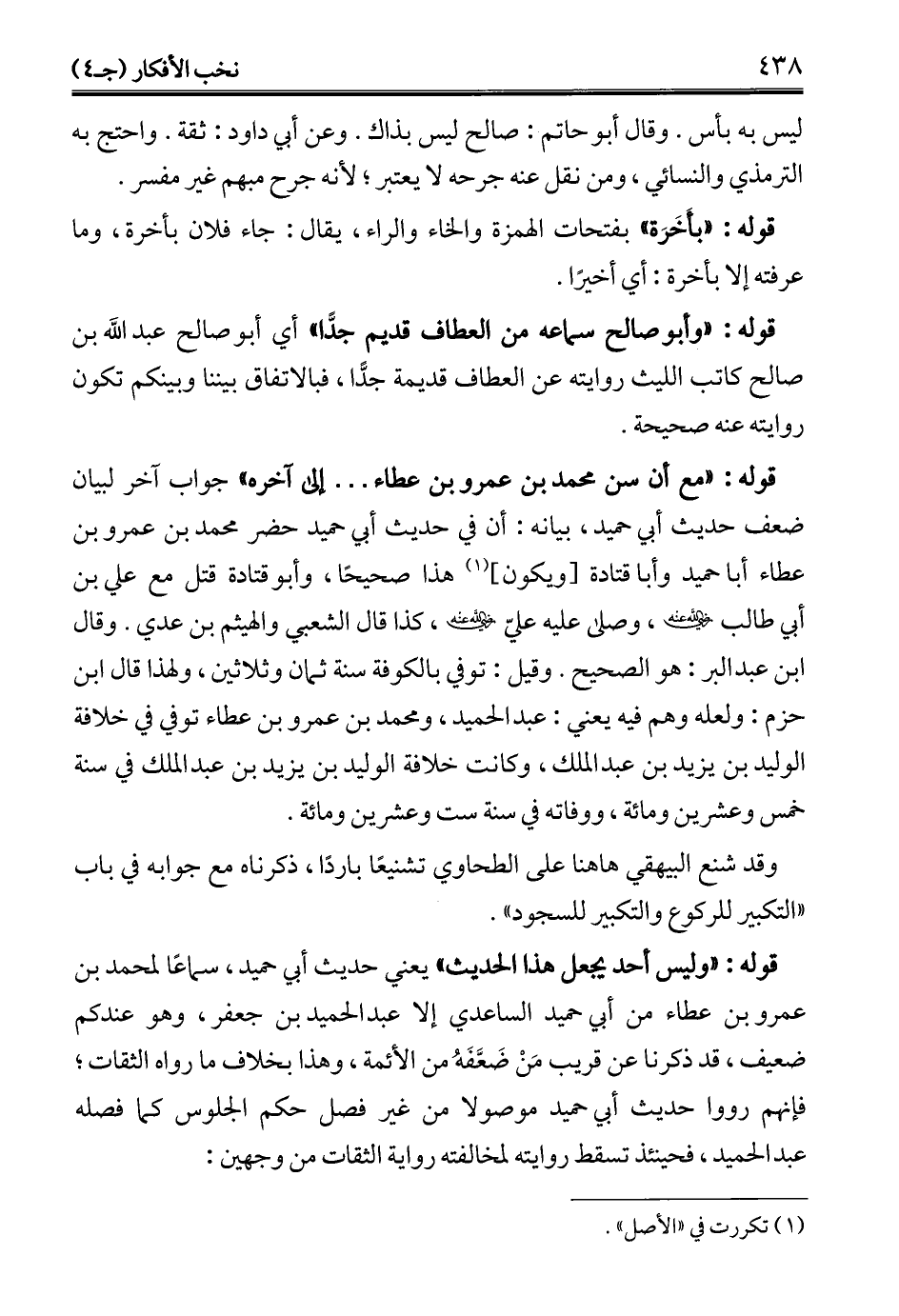 قوله: "وأبو صالح سماعه من العطاف قديم جدًّا" أبي أبو صالح عبد الله بن صالح كاتب الليث روايته عن العطاف قديمة جدًّا، فبالاتفاق بيننا وبينكم تكون روايته عنه صحيحة.