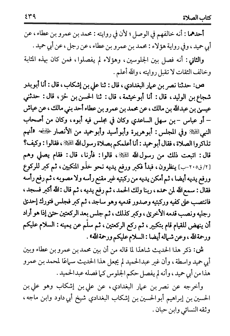 ص: حدثنا نصر بن عمار البغدادي، قال: ثنا علي بن إشكاب، قال: أنا أبو بدر شجاع بن الوليد، قال: أنا أبو خيثمة، قال: ثنا الحسن بن حُرّ، قال: حدثني عيسى بن عبد الله بن مالك، عن محمَّد بن عمرو بن عطاء أحد بني مالك، عن عياش -أو عباس- بن سهل الساعدي وكان في مجلس فيه أبوه، وكان من أصحاب النبي - عليه السلام - وفي المجلس: أبو هريرة وأبو أسيد وأبو حميد من الأنصار - رضي الله عنهم - "أنهم تذاكرو الصلاة، فقال أبو حميد: أنا أعلمكم بصلاة رسول الله - عليه السلام -، فقالوا: وكيف؟ قال: اتبعت ذلك من رسول الله - عليه السلام -، قالوا: فأرنا، قال: فقام يصلي وهم ينظرون، فبدأ فكبر ورفع يديه نحو حَذْو المنكبين، ثم كبر للركوع ورفع يديه أيضًا، ثم أمكن يديه من ركبتيه غير مقنع رأسه ولا مصوبه، ثم رفع رأسه فقال: سمع الله لمن حمده، ربنا ولك الحمد، ثم رفع يديه، ثم قال: الله أكبر فسجد، فانتصب على كفيه وركبتيه وصدور قدميه وهو ساجد، ثم كبر فجلس فتورك إحدى رجليه ونصب قدمه الأخرى، وكبر كذلك، ثم جلس بعد الركعتين حتى إذا هو أراد أن ينهض للقيام قام بتكبير، ثم ركع الركعتين، ثم سلَّم عن يمينه: السلام عليكم ورحمة الله، وعن شماله أيضًا: السلام عليكم ورحمة الله".