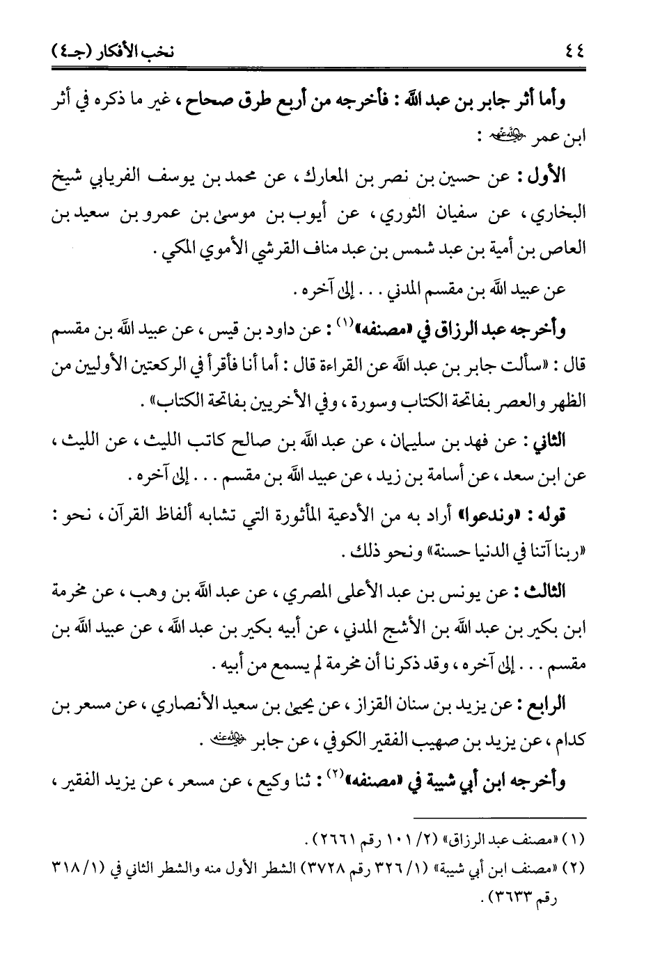 وأما أثر جابر بن عبد الله: فأخرجه من أربع طرق صحاح، غير ما ذكره في أثر ابن عمر - رضي الله عنهم -:
