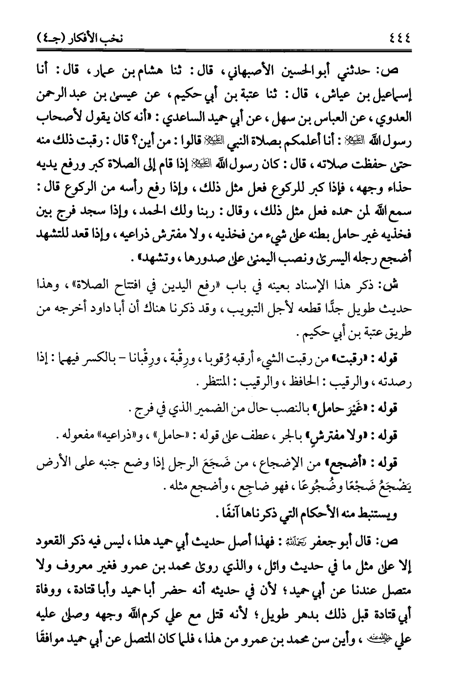 ص: حدثني أبو الحسين الأصبهاني، قال: ثنا هشام بن عمار، قال: أنا إسماعيل بن عياش، قال: ثنا عتبة بن أبي حكيم، عن عيسى بن عبد الرحمن العدوي، عن العباس بن سهل، عن أبي حميد الساعدي: "أنه كان يقول لأصحاب رسول الله - عليه السلام -: أنا أعلمكم بصلاة النبي - عليه السلام - قالوا: من أين؟ قال: رقبت ذلك منه حتى حفظت صلاته، قال: كان رسول الله - عليه السلام - إذا قام إلى الصلاة كبر ورفع يديه حذاء وجهه، فإذا كبر للركوع فعل مثل ذلك، وإذا رفع رأسه من الركوع قال: سمع الله لمن حمده فعل مثل ذلك، وقال: ربنا ولك الحمد، وإذا سجد فرج بين فخذيه غير حامل بطنه على شيء من فخذيه، ولا مفترش ذراعيه، وإذا قعد للتشهد أضجع رجله اليسرى ونصب اليمنى على صدورها، وتشهد".