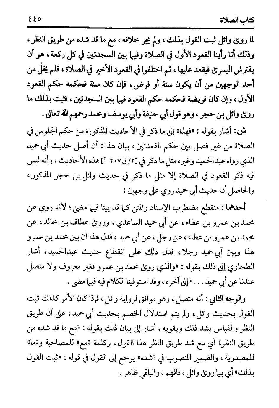 والوجه الثاني: أنه متصل، وهو موافق لرواية وائل، فإذا كان الأمر كذلك ثبت القول بحديث وائل، ولم يتم استدلال الخصم بحديث أبي حميد، على أن طريق النظر والقياس يشد ذلك ويقويه، أشار إلى بيان ذلك بقوله: "مع ما قد شده من طريق النظر" أي مع شد طريق النظر هذا القول، وكلمة "مع" للمصاحبة و"ما" للمصدرية، والضمير المنصوب في "شده" يرجع إلى القول في قوله: "ثبت القول بذلك" أي بما روى وائل، فافهم، والباقي ظاهر.
