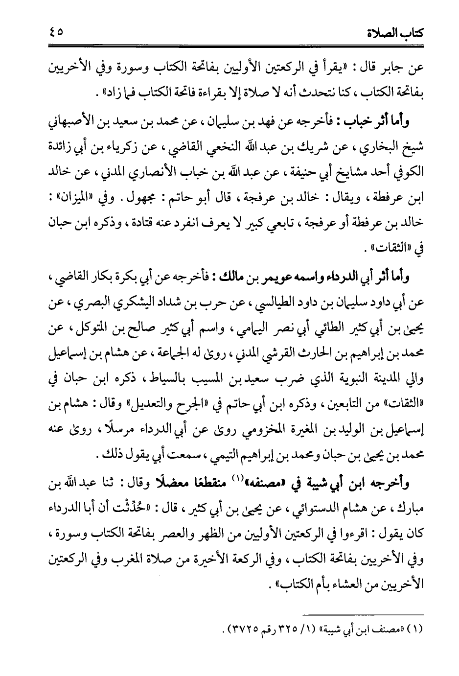 وأخرجه ابن أبي شيبة في "مصنفه" (¬1) منقطعًا معضلًا وقال: ثنا عبد الله بن مبارك، عن هشام الدستوائي، عن يحيى بن أبي كثير، قال: "حُدِّثْت أن أبا الدرداء كان يقول: اقرءوا في الركعتين الأوليين من الظهر والعصر بفاتحة الكتاب وسورة، وفي الأخريين بفاتحة الكتاب، وفي الركعة الأخيرة من صلاة المغرب وفي الركعتين الآخريين من العشاء بأم الكتاب".