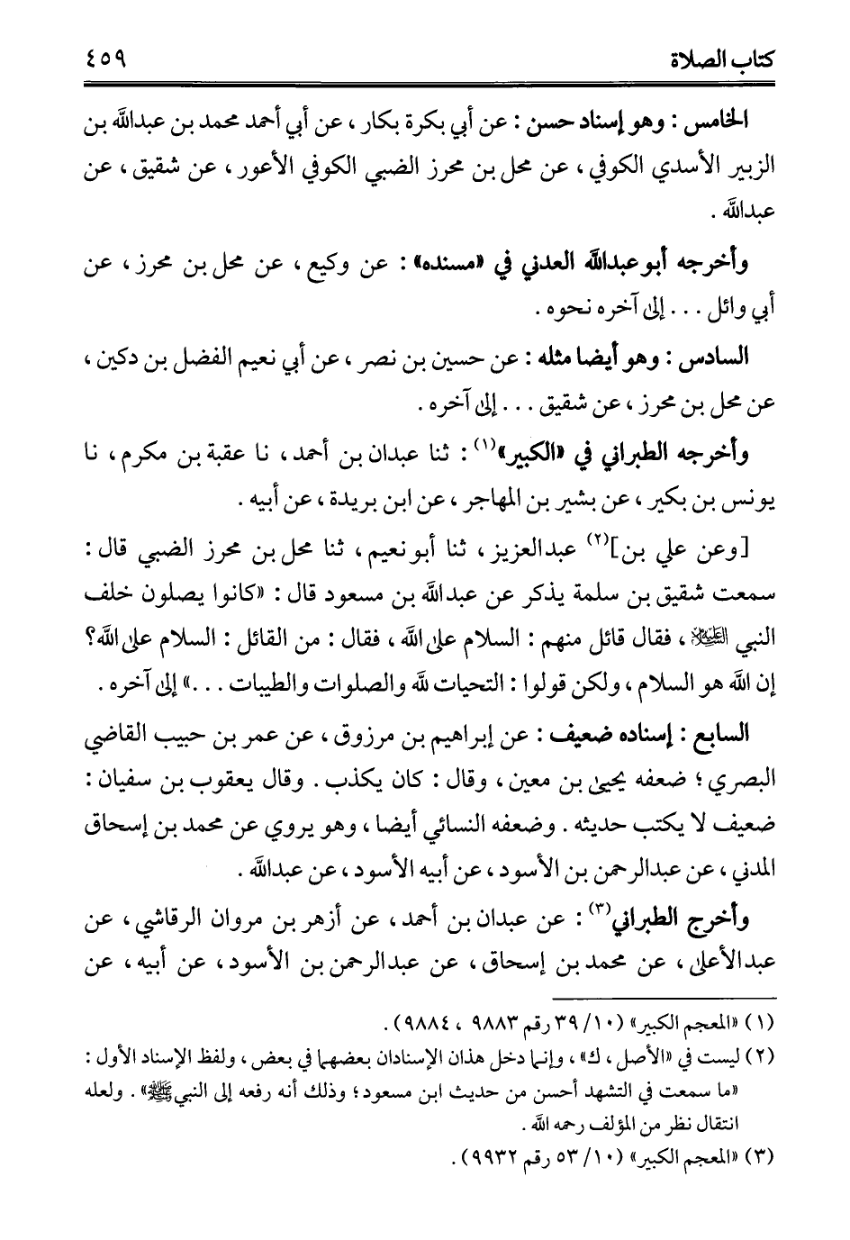 الخامس: وهو إسناد حسن: عن أبي بكرة بكار، عن أبي أحمد محمَّد بن عبد الله بن الزبير الأسدي الكوفي، عن محل بن محرز الضبي الكوفي الأعور، عن شقيق، عن عبد الله.