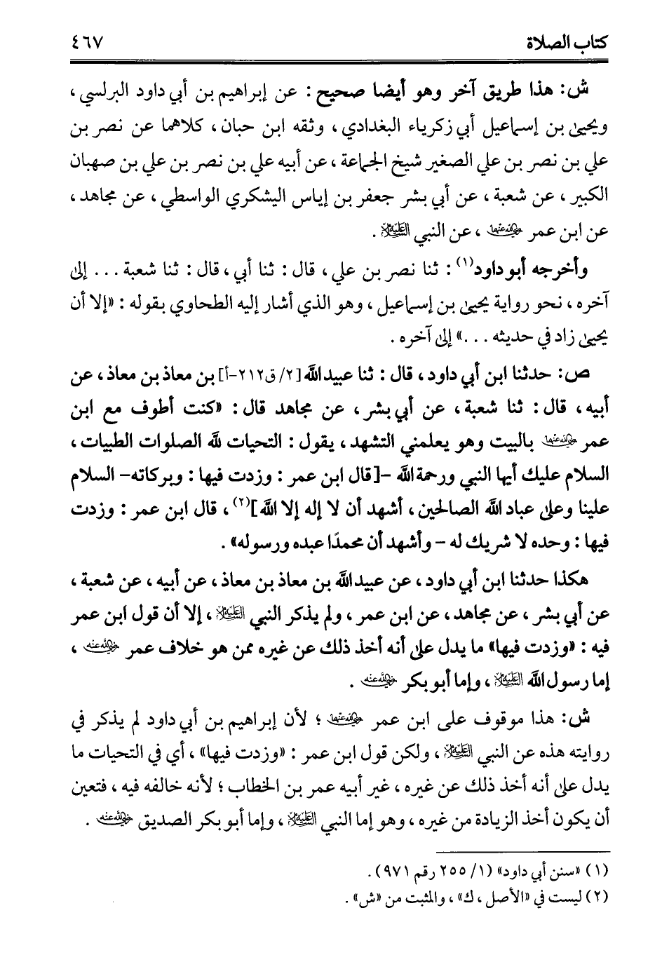ش: هذا طريق أخر وهو أيضا صحيح: عن إبراهيم بن أبي داود البرلسي، يحيى بن إسماعيل أبي زكرياء البغدادي، وثقه ابن حبان، كلاهما عن نصر بن علي بن نصر بن علي الصغير شيخ الجماعة، عن أبيه علي بن نصر بن علي بن صهبان الكبير، عن شعبة، عن أبي بشر جعفر بن إياس اليشكري الواسطي، عن مجاهد، عن ابن عمر- رضى الله عنهما -, عن النبي - عليه السلام -.