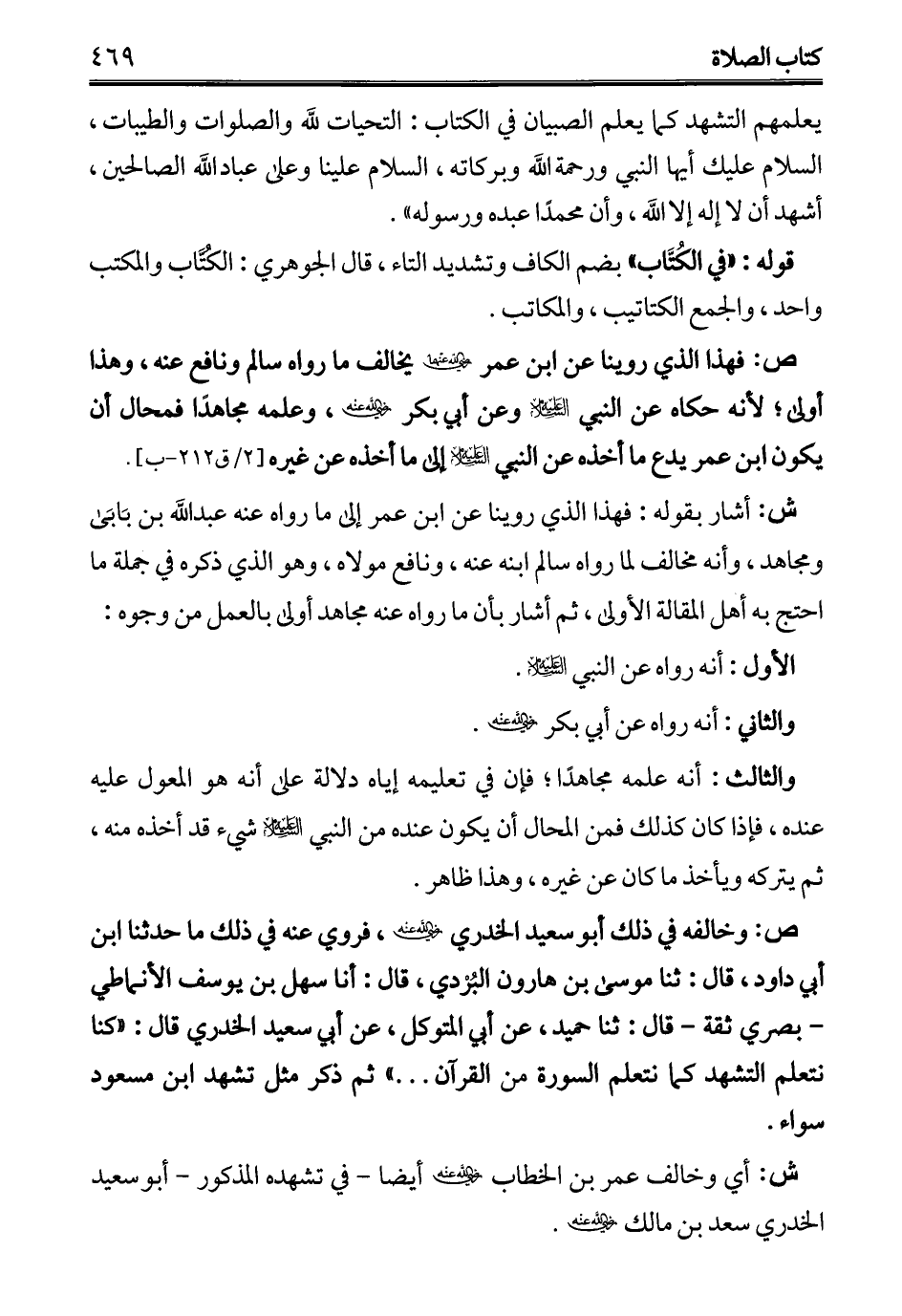 ش: أي وخالف عمر بن الخطاب - رضى الله عنه - في تشهده المذكور- أبو سعيد الخدري سعد بن مالك - رضي الله عنه -.