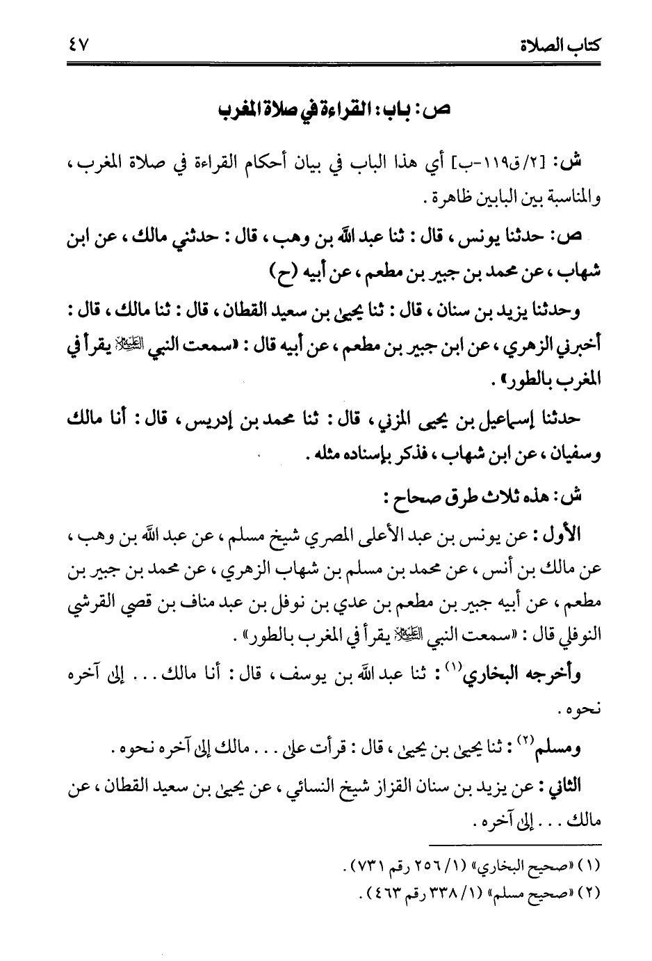 الأول: عن يونس بن عبد الأعلى المصري شيخ مسلم، عن عبد الله بن وهب، عن مالك بن أنس، عن محمَّد بن مسلم بن شهاب الزهري، عن محمَّد بن جبير بن مطعم، عن أبيه جبير بن مطعم بن عدي بن نوفل بن عبد مناف بن قصي القرشي النوفلي قال: "سمعت النبي - عليه السلام - يقرأ في المغرب بالطور".