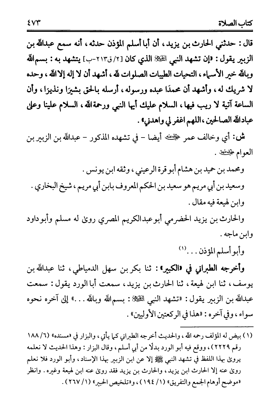 وأخرجه الطبراني في "الكبير": ثنا بكر بن سهل الدمياطي, ثنا عبد الله بن يوسف, ثنا ابن لهيعة ثنا الحارث بن يزيد، سمعت أبا الورد يقول: سمعت عبد الله بن الزبير يقول: "تشهد النبي - عليه السلام -: بسم الله وبالله ... " إلى آخره نحوه سواء، وفي آخره: "هذا في الركعتين الأولين".