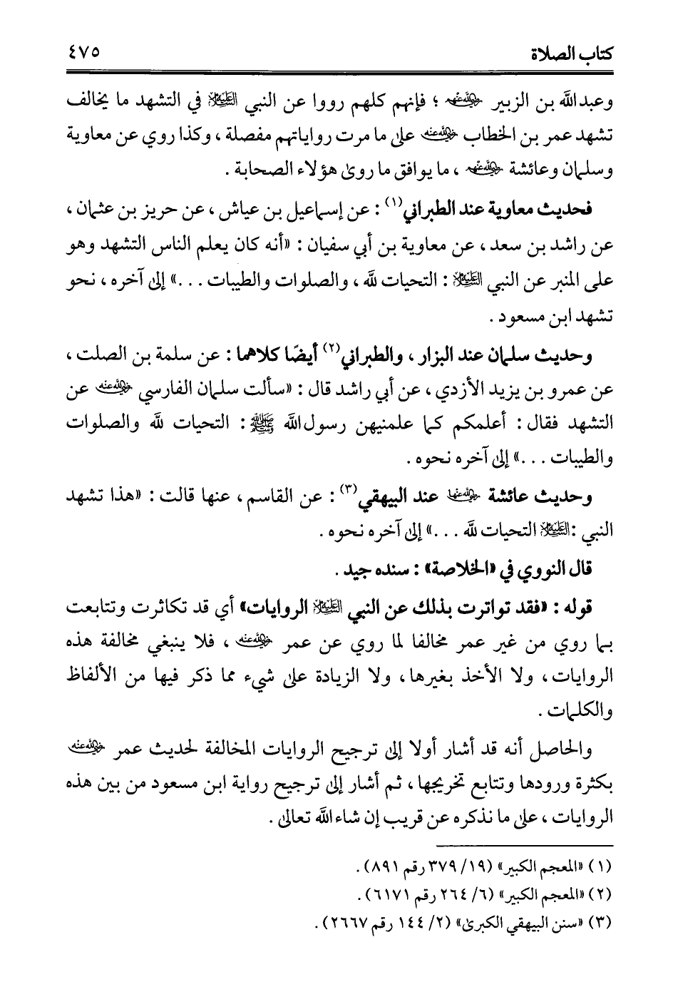 والحاصل أنه قد أشار أولا إلى ترجيح الروايات المخالفة لحديث عمر- رضى الله عنه - بكثرة ورودها وتتابع تخريجها، ثم أشار ترجيح رواية ابن مسعود من بين هذه الروايات، على ما نذكره عن قريب إن شاء الله تعالى.