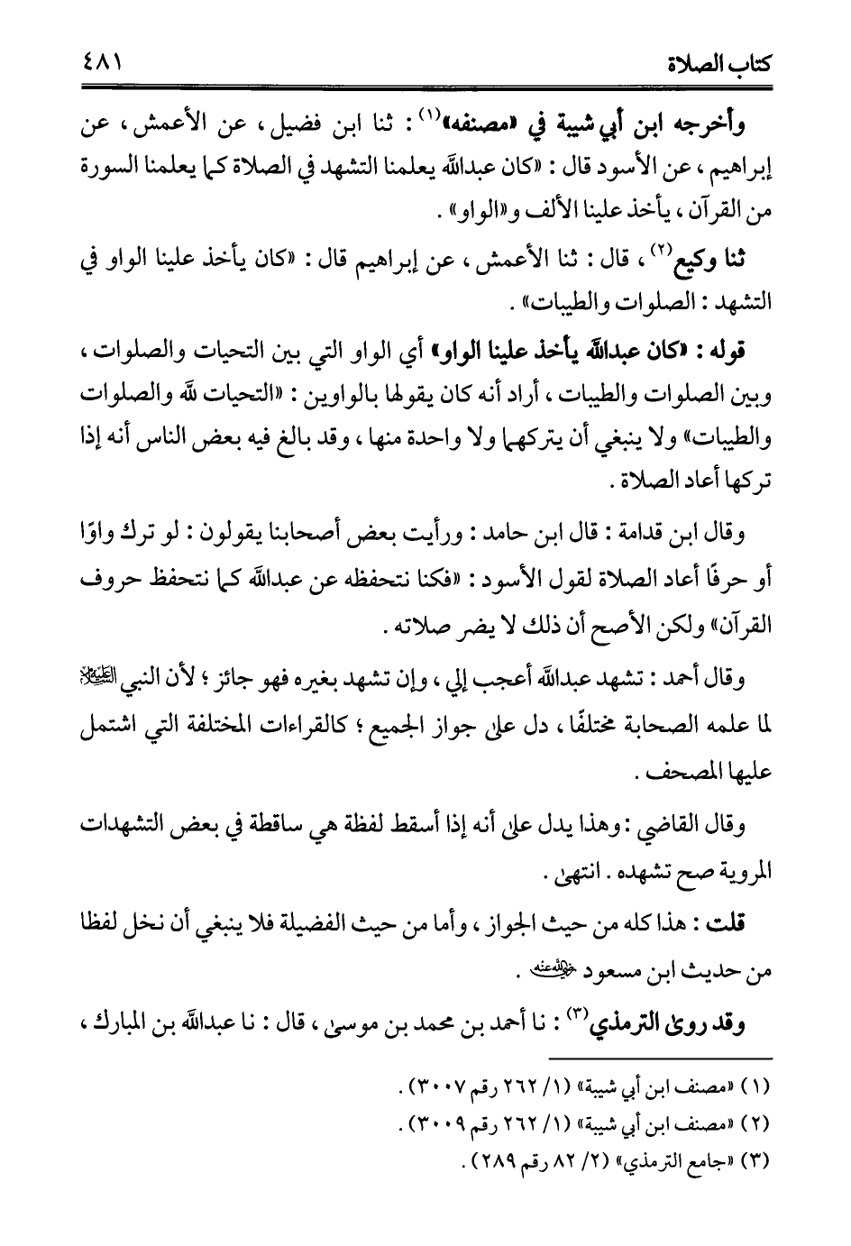وقال ابن قدامة: قال ابن حامد: ورأيت بعض أصحابنا يقولون: لو ترك واوًا أو حرفًا أعاد الصلاة لقول الأسود: "فكنا نتحفظه عن عبد الله كما نتحفظ حروف القرآن" ولكن الأصح أن ذلك لا يضر صلاته.