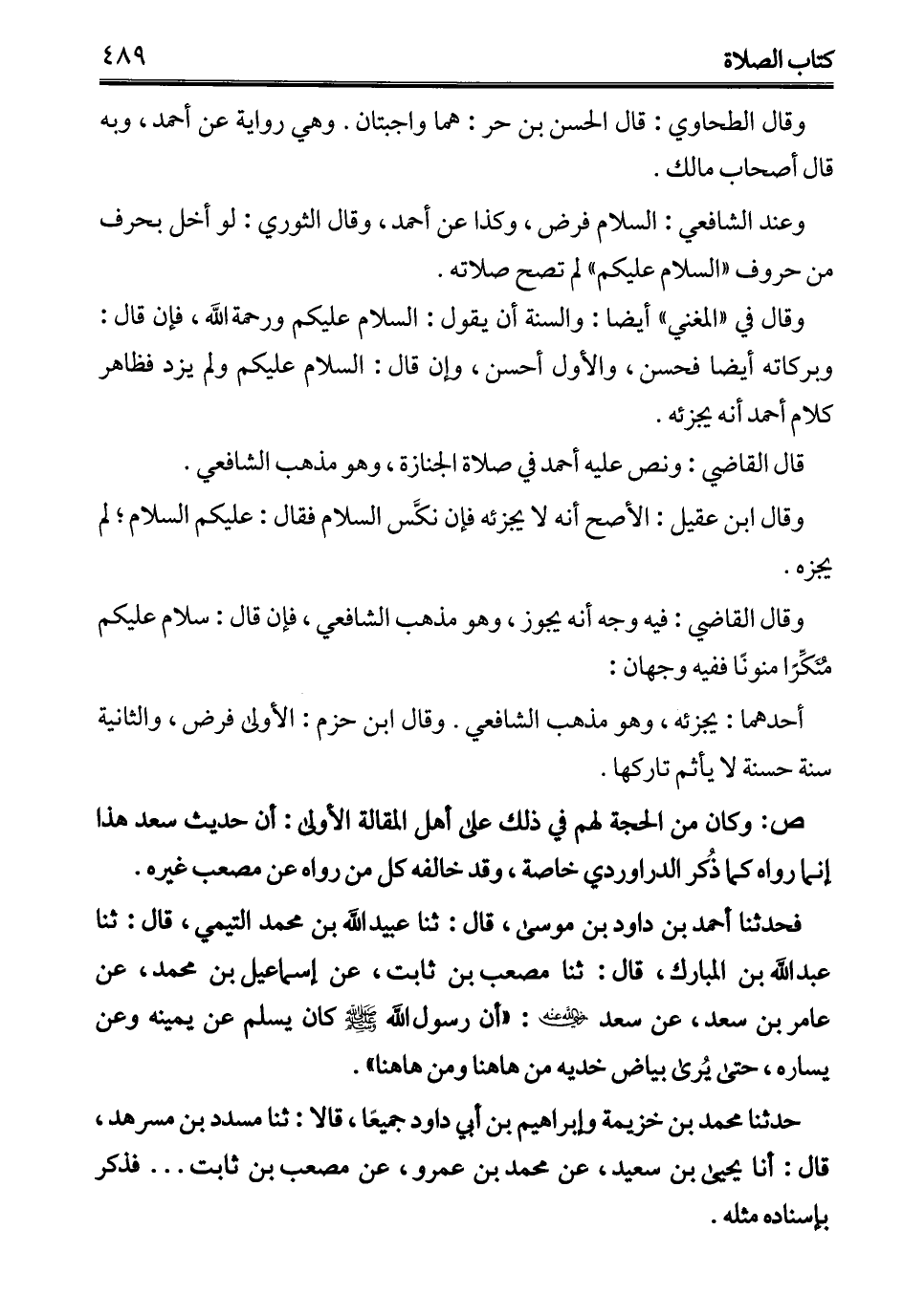 فحدثنا أحمد بن داود بن موسى، قال: ثنا عبيد الله بن محمَّد التيمي، قال: ثنا عبد الله بن المبارك، قال: ثنا مصعب بن ثابت، عن إسماعيل بن محمَّد، عن عامر بن سعد، عن سعد - رضي الله عنه -: "أن رسول الله - صلى الله عليه وسلم - كان يسلم عن يمينه وعن يساره، حتى يُرى بياض خديه من ها هنا ومن ها هنا".