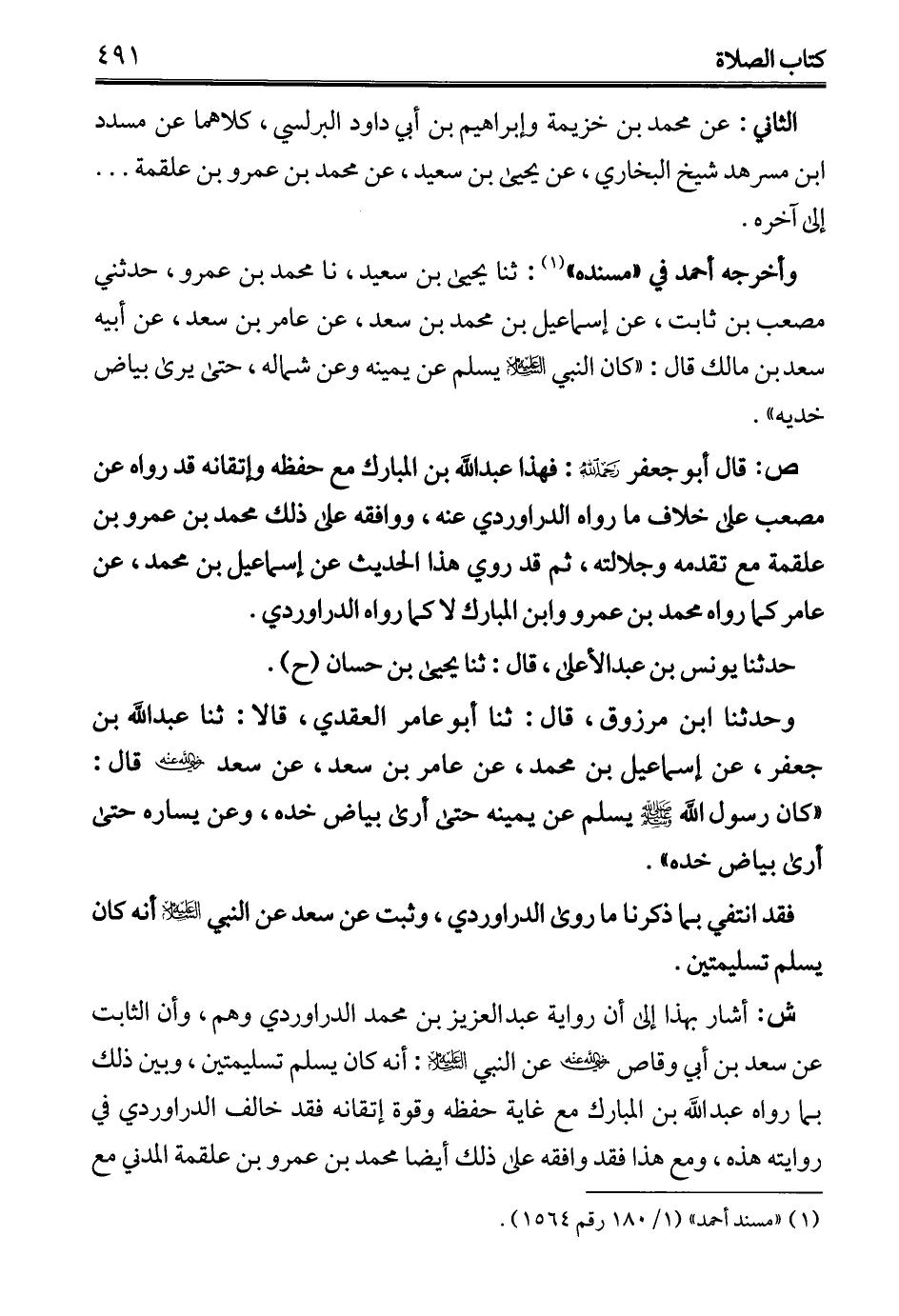 ش: أشار بهذا إلى أن رواية عبد العزيز بن محمَّد الدراوردي وهم، وأن الثابت عن سعد بن أبي وقاص - رضي الله عنه - عن النبي - عليه السلام -: أنه كان يسلم تسليمتين، وبين ذلك بما رواه عبد الله بن المبارك مع غاية حفظه وقوة إتقانه فقد خالف الدراوردي في روايته هذه، ومع هذا فقد وافقه على ذلك أيضًا محمَّد بن عمرو بن علقمة المدني مع