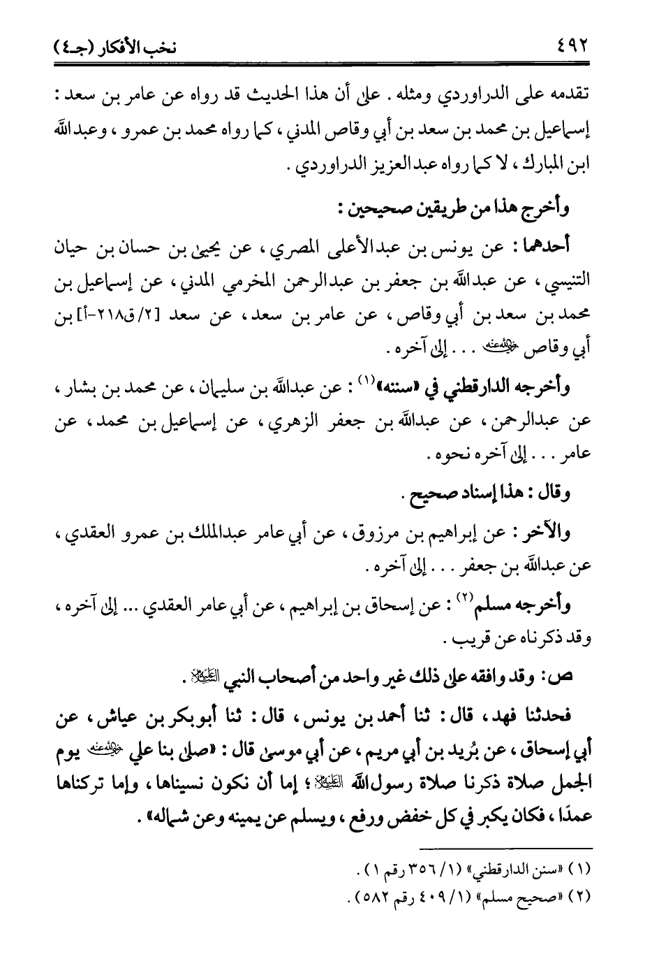 تقدمه على الدراوردي ومثله. على أن هذا الحديث قد رواه عن عامر بن سعد: إسماعيل بن محمَّد بن سعد بن أبي وقاص المدني، كما رواه محمَّد بن عمرو، وعبد الله ابن المبارك، لا كما رواه عبد العزيز الدراوردي.