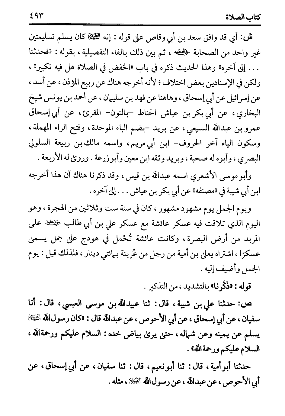 ش: أي قد وافق سعد بن أبي وقاص على قوله: إنه - عليه السلام - كان يسلم تسليمتين غير واحد من الصحابة - رضي الله عنهم -، ثم بين ذلك بالفاء التفصيلية، بقوله: "فحدثنا ... إلى آخره" وهذا الحديث ذكره في باب "الخفض في الصلاة هل فيه تكبير"، ولكن في الإسنادين بعض اختلاف؛ لأنه أخرجه هناك عن ربيع المؤذن، عن أسد، عن إسرائيل عن أبي إسحاق، وها هنا عن فهد بن سليمان، عن أحمد بن يونس شيخ البخاري، عن أبي بكر بن عياش الحناط -بالنون- المقرئ، عن أبي إسحاق عمرو بن عبد الله السبيعي، عن بريد -بضم الباء الموحدة، وفتح الراء المهملة، وسكون الياء آخر الحروف- ابن أبي مريم، واسمه مالك بن ربيعة السلولي البصري، وأبوه له صحبة، وبريد وثقه ابن معين وأبو زرعة. وروى له الأربعة.