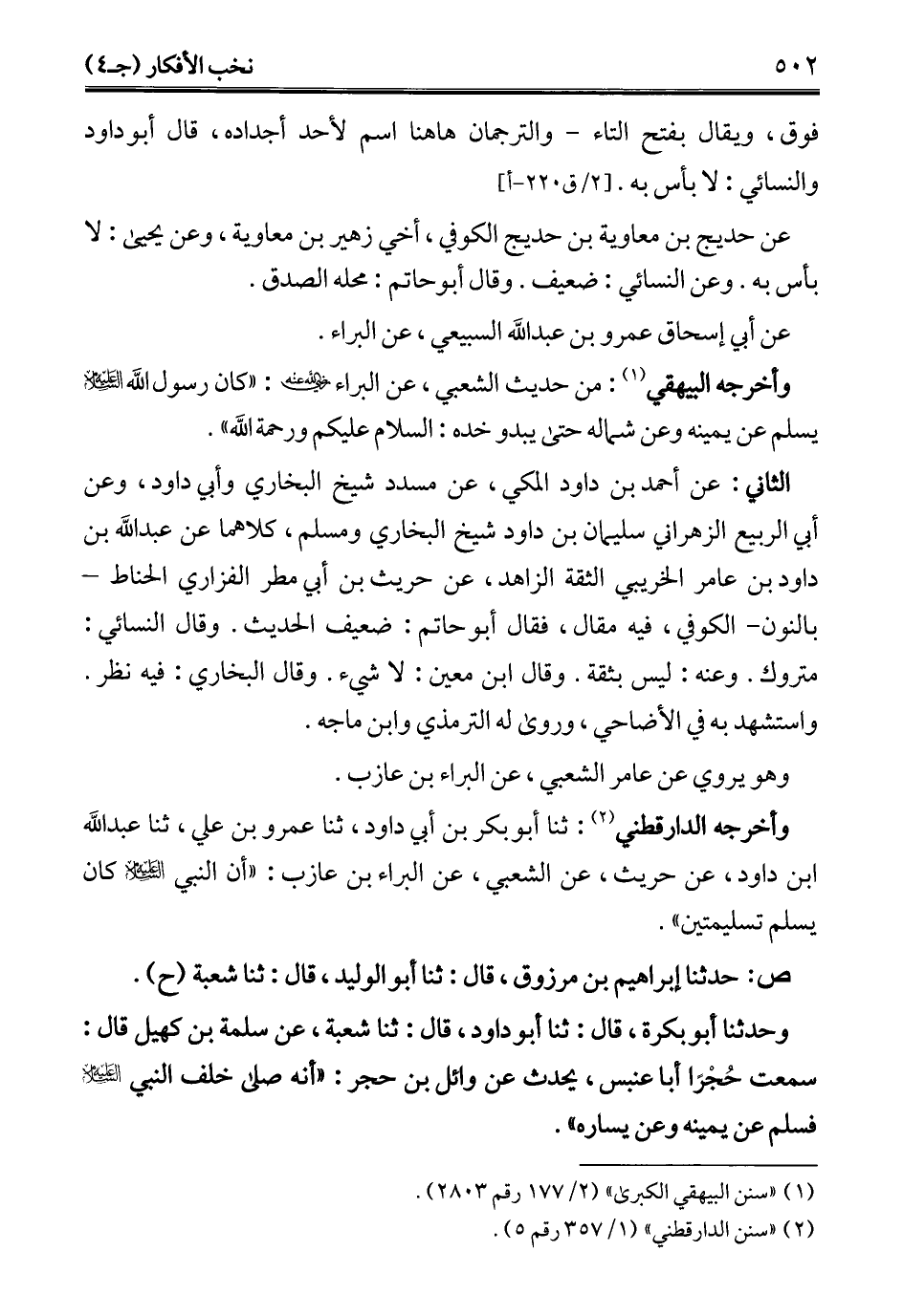 وأخرجه الدارقطني (¬2): ثنا أبو بكر بن أبي داود، ثنا عمرو بن علي، ثنا عبد الله ابن داود، عن حريث، عن الشعبي، عن البراء بن عازب: "أن النبي - عليه السلام - كان يسلم تسليمتين".