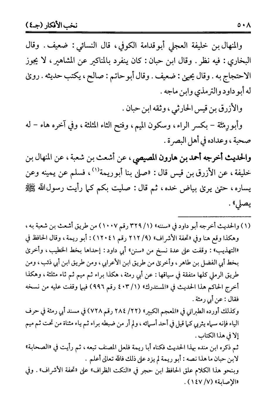 (¬1) والحديث أخرجه أبو داود في "سننه" (1/ 329 رقم 1007) من طريق أشعث بن شعبة به، وهكذا وقع هنا وفي "تحفة الأشراف" (9/ 212 رقم 12041): أبو ريمة، وقال الحافظ في "التهذيب": وقفت على عدة نسخ من "سنن" أبي داود: إحداها بخط الخطيب، وأخرى بخط أبي الفضل بن طاهر، وأخرى من طريق ابن الأعرابي، ومن طريق ابن أبي ذئب، ومن طريق الرملي كلها متفقة في سياقها: عن أبي رمثة، هكذا براء ثم ميم ثم ثاء مثلثة، وهكذا أخرج الحاكم هذا الحديث في "المستدرك" (1/ 403 رقم 996) فيما وقفت عليه من نسخه فقال: عن أبي رمثة.