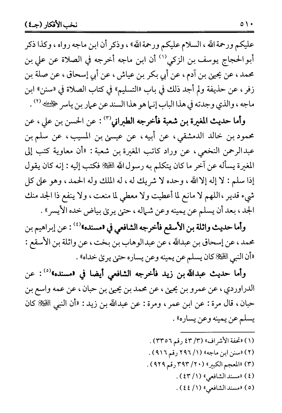 وأما حديث واثلة بن الأسقع فأخرجه الشافعي في "مسنده" (¬4): عن إبراهيم بن محمَّد، عن إسحاق بن عبد الله، عن عبد الوهاب بن بخت، عن واثلة بن الأسقع: "أن النبي - عليه السلام - كان يسلم عن يمينه وعن يساره حتى يرى خداه".