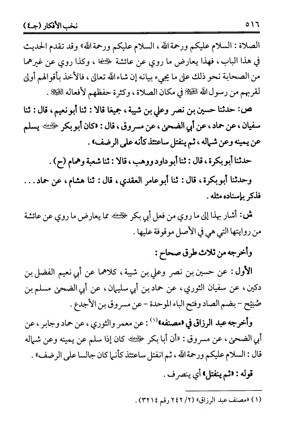 ص: حدثنا حسين بن نصر وعلي بن شيبة، جميعًا قالا: ثنا أبو نعيم، قال: ثنا سفيان، عن حماد، عن أبي الضحى، عن مسروق، قال: "كان أبو بكر - رضي الله عنه - يسلم عن يمينه وعن شماله، ثم ينفتل ساعتئذ كأنه على الرضف".