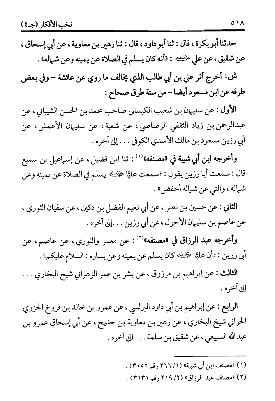 حدثنا أبو بكرة، قال: ثنا أبو داود، قال: ثنا زهير بن معاوية، عن أبي إسحاق، عن شقيق، عن علي - رضي الله عنه -: "أنه كان يسلم في الصلاة عن يمينه وعن شماله".